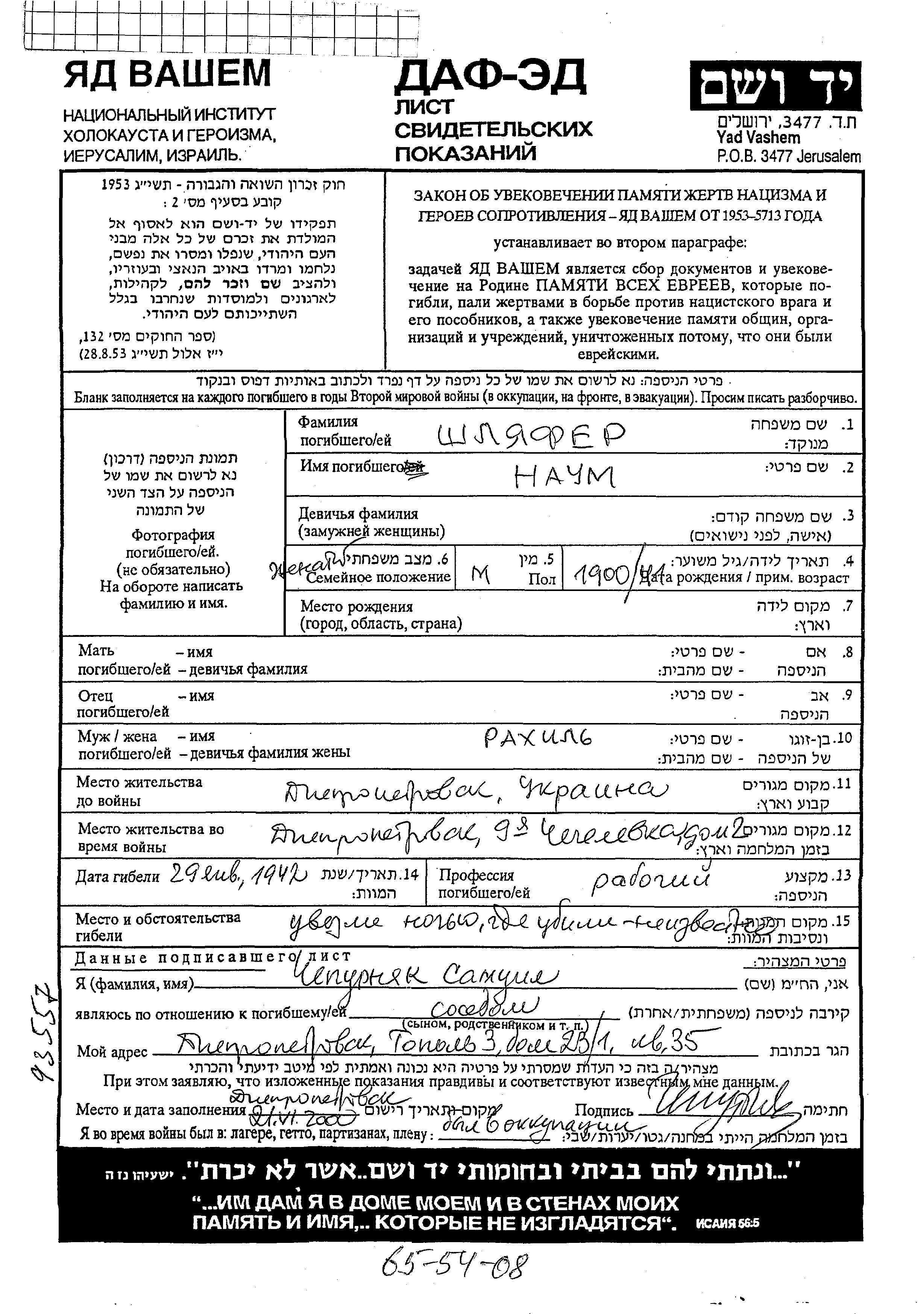 Shlyafer Nakhum 1900 Dnepropetrovsk, Ukraine (URSS) Feuille de témoignage