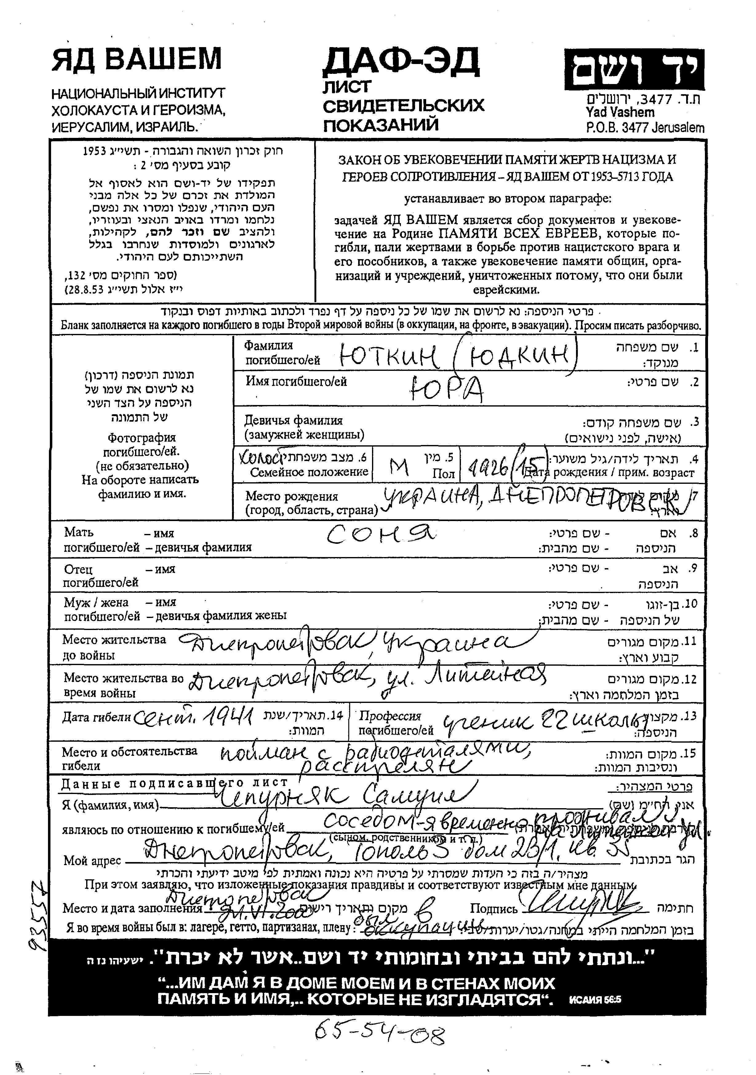 Yutkin Yura 1926 Dnepropetrovsk, Ukraine (URSS) Feuille de témoignage