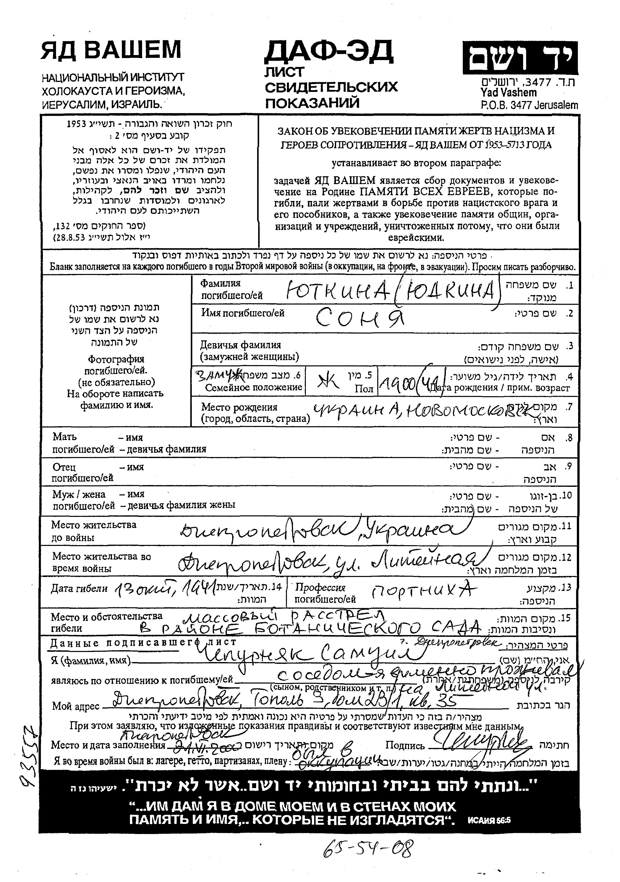 Yutkina Sonya 1900 Dnepropetrovsk, Ukraine (URSS) Feuille de témoignage
