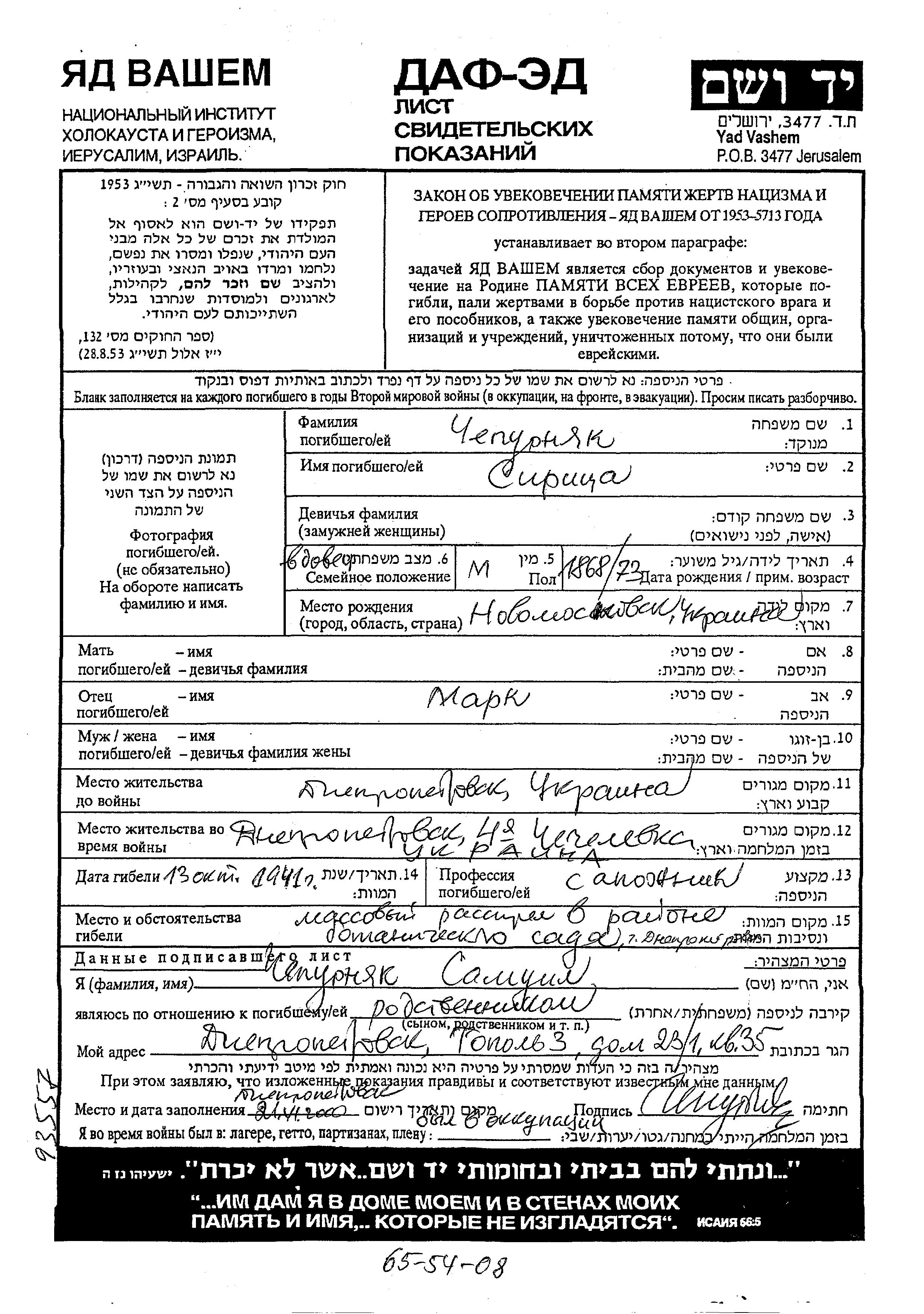 Yad Vashem - Pages of Testimony Names Memorial Collection