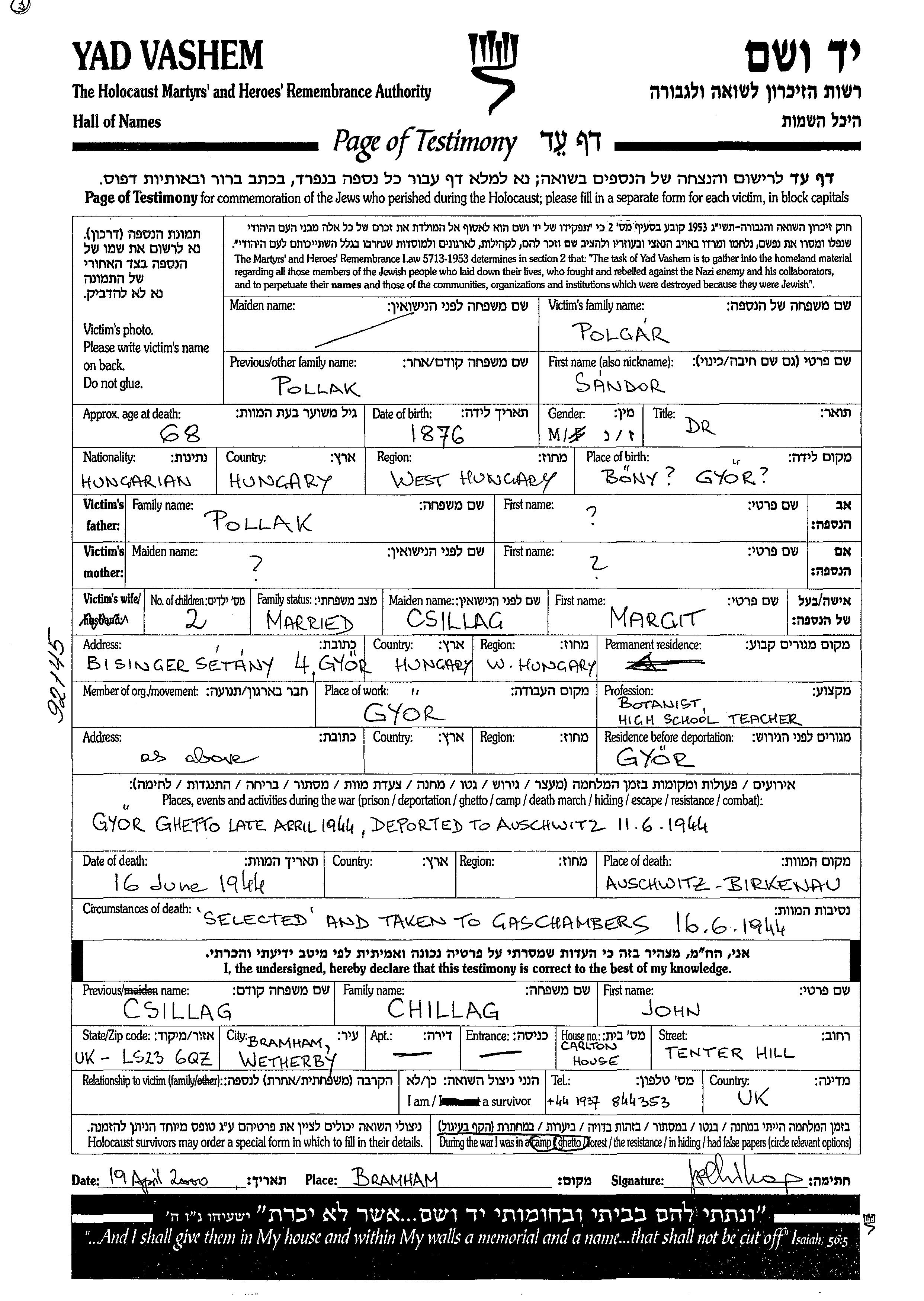 Sandor Polgar Pollak est né à Bony, Hongrie en 1876. Il était Botanist et Mariée à Margit née Csillag. Avant la seconde guerre mondiale il vivait à Gyor, Hongrie. Au cours de la guerre, il était à Gyor, Hongrie.