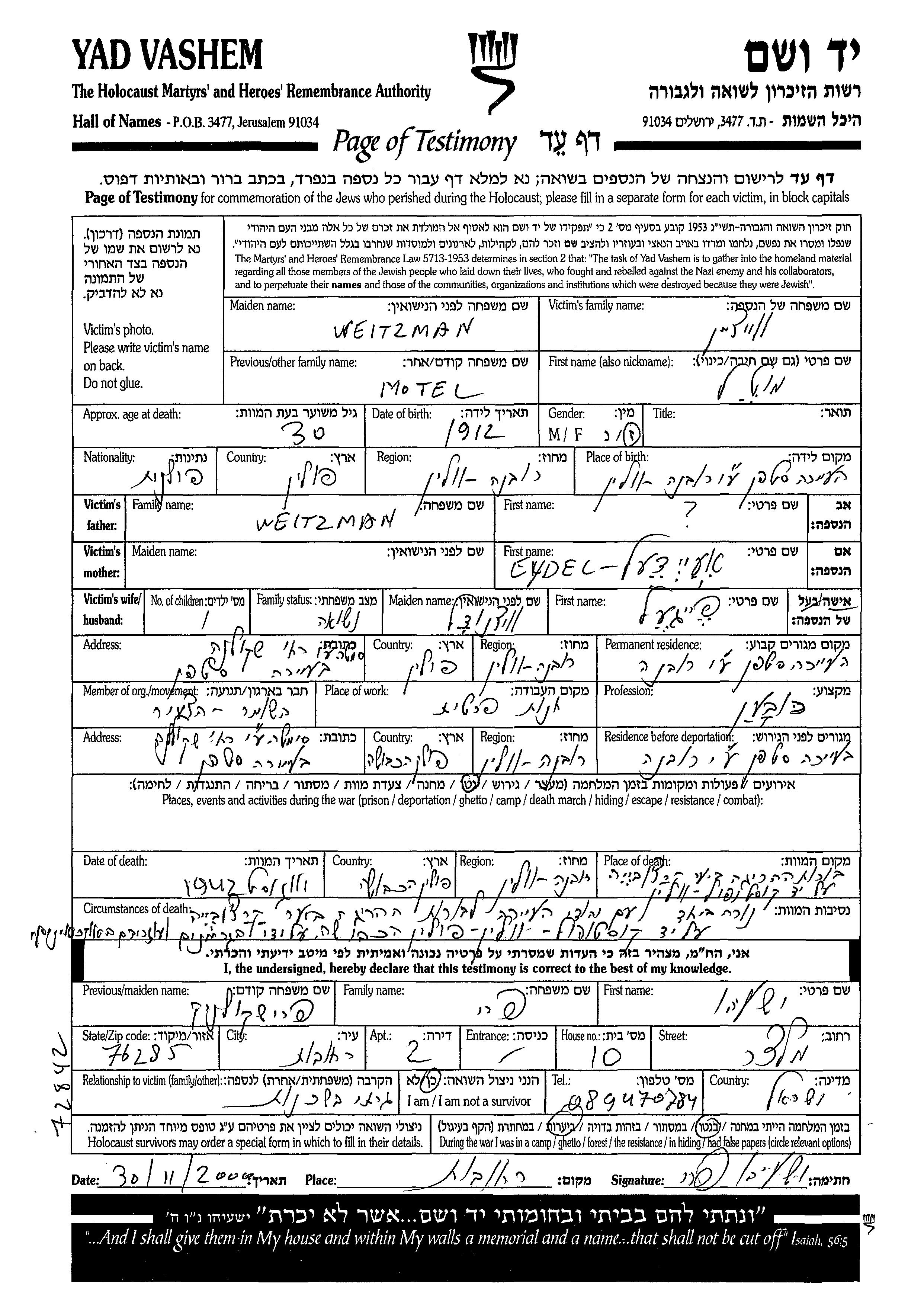 Motel Weitzman est né à Stepań, Pologne en 1912, fils de Eydel. Il était Modiste et Mariée à Feigel née Vitznudel. Avant la seconde guerre mondiale il vivait à Stepań, Pologne. Au cours de la guerre, il était à Stepań, Pologne.
