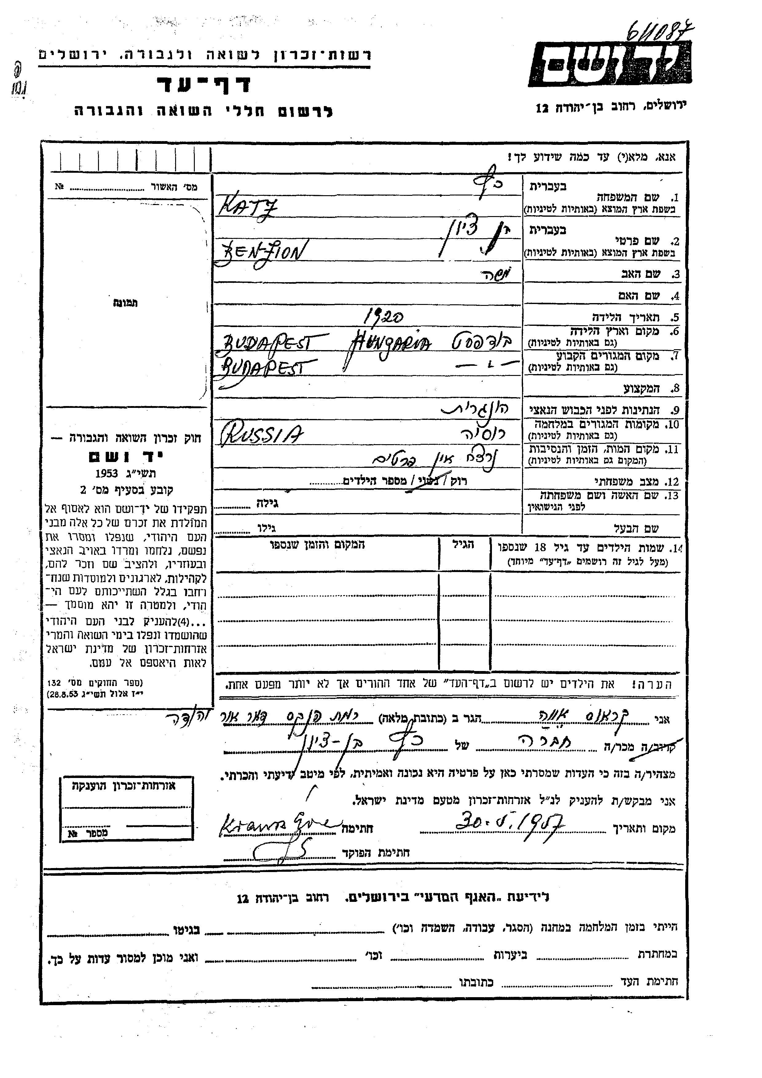 Katz Benzion 1920 Budapest, Hongrie Feuille de témoignage