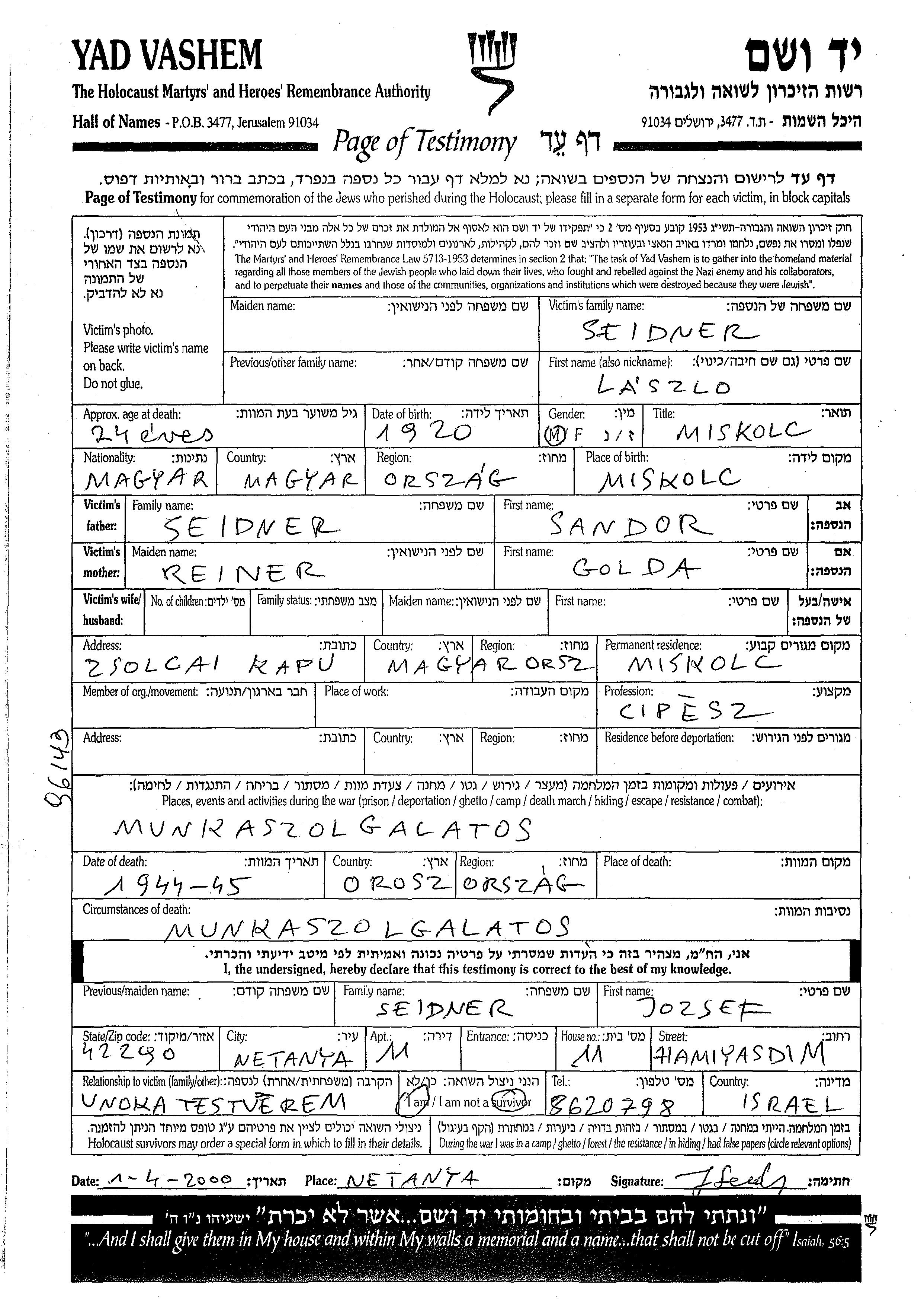 Seidner Laszlo 1920 Miskolc, Hongrie Feuille de témoignage