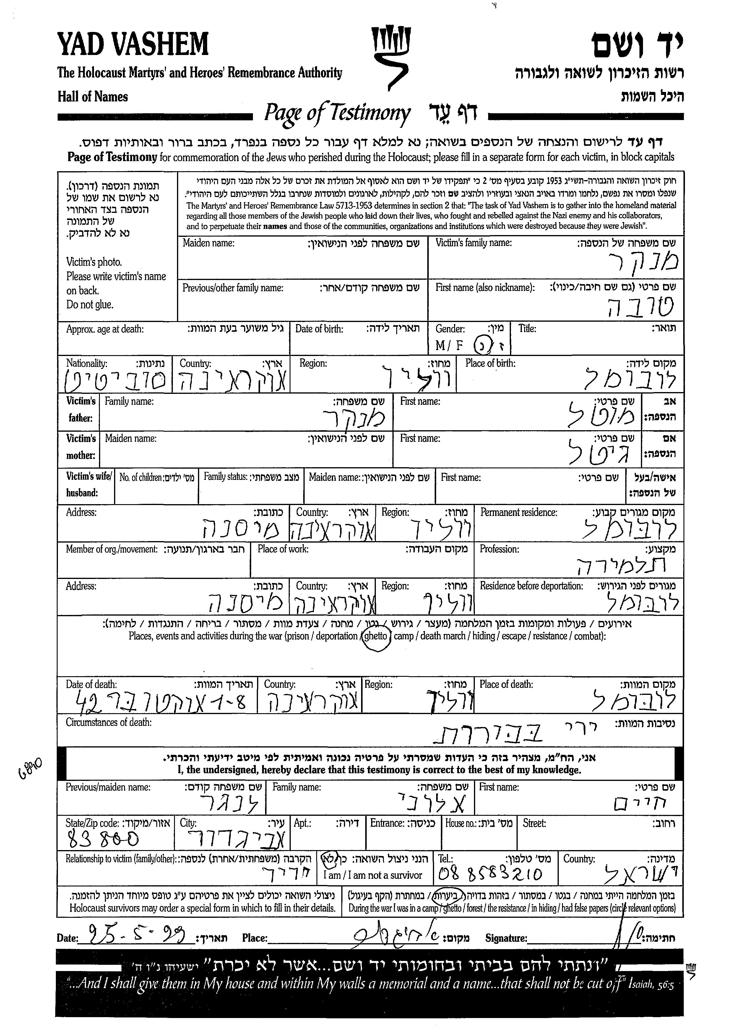 Yad Vashem - Pages of Testimony Names Memorial Collection