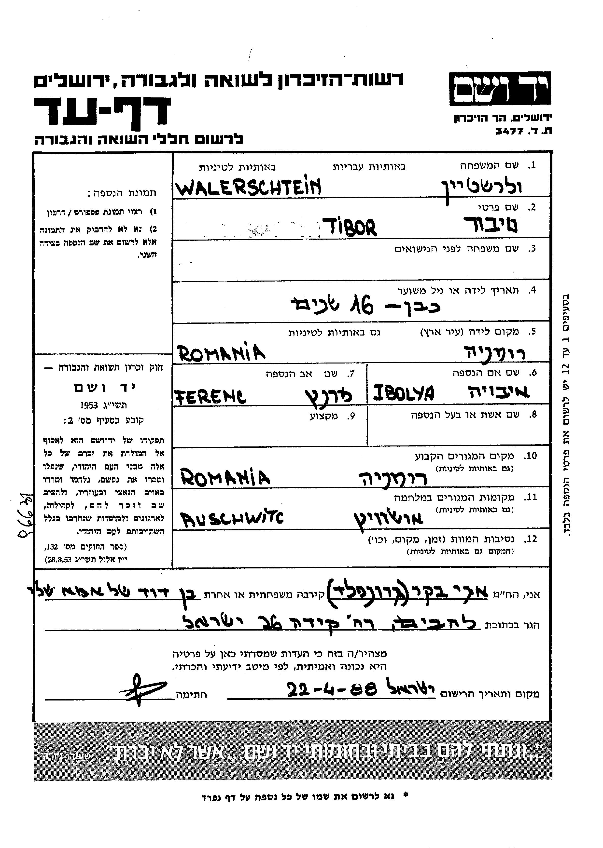 Walerschtein Tibor Roumanie Feuille de témoignage