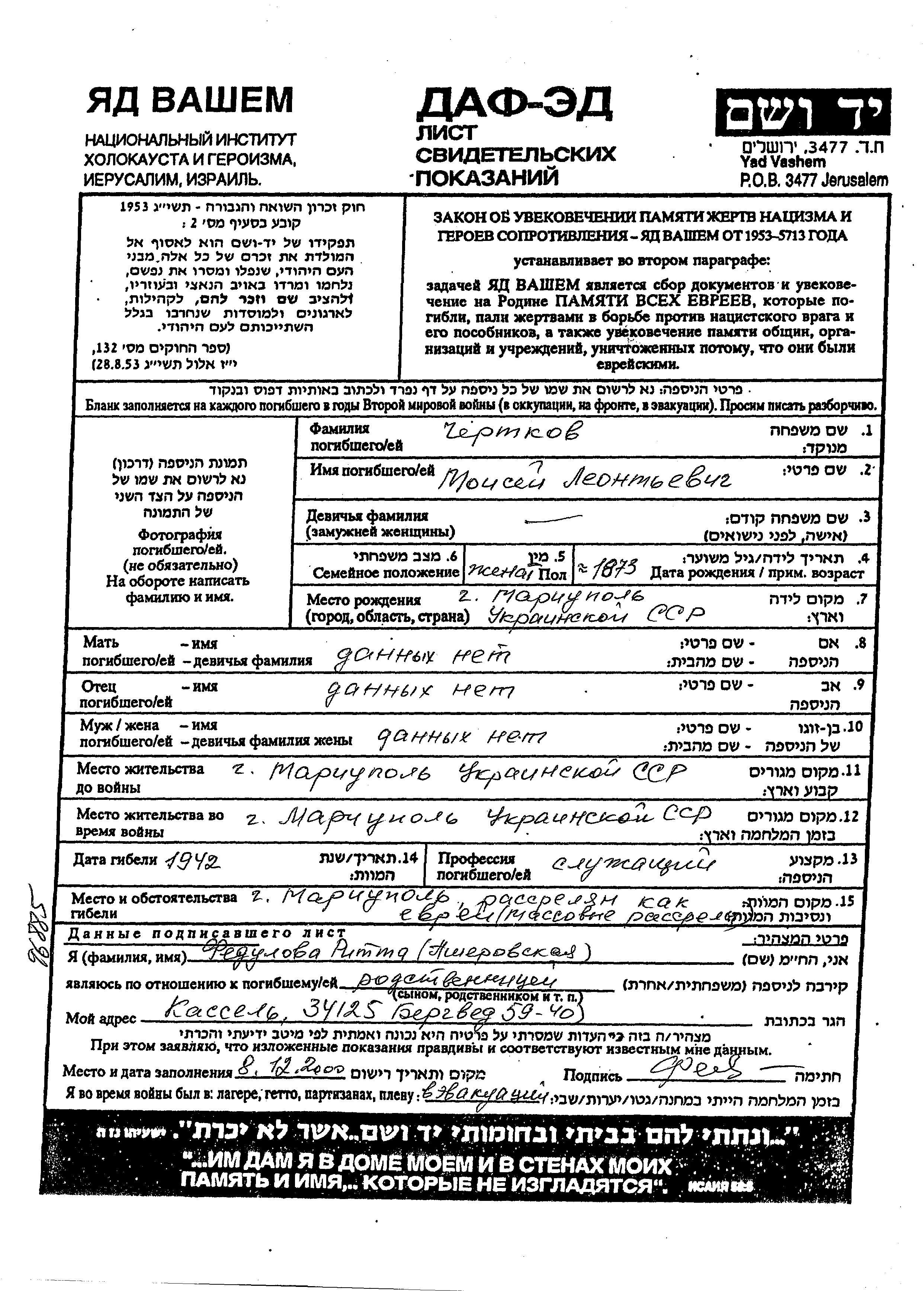 Yad Vashem - Pages of Testimony Names Memorial Collection