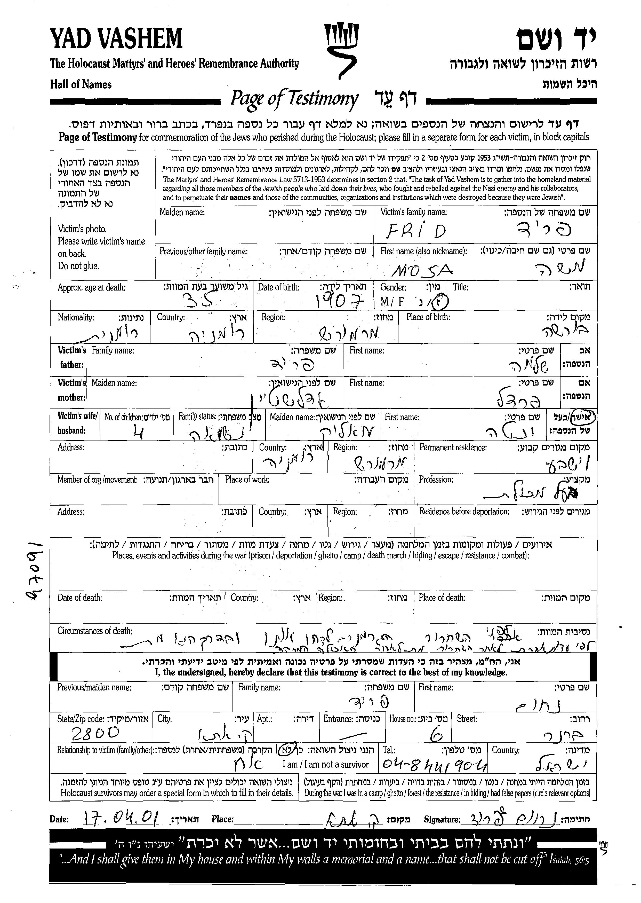 Mosa Frid est né à Borsa, Roumanie en 1907, fils de Shlomo et de Fradel. Il était Mariée à Yenta née Malik. Avant la seconde guerre mondiale il vivait à Viseu, Roumanie.