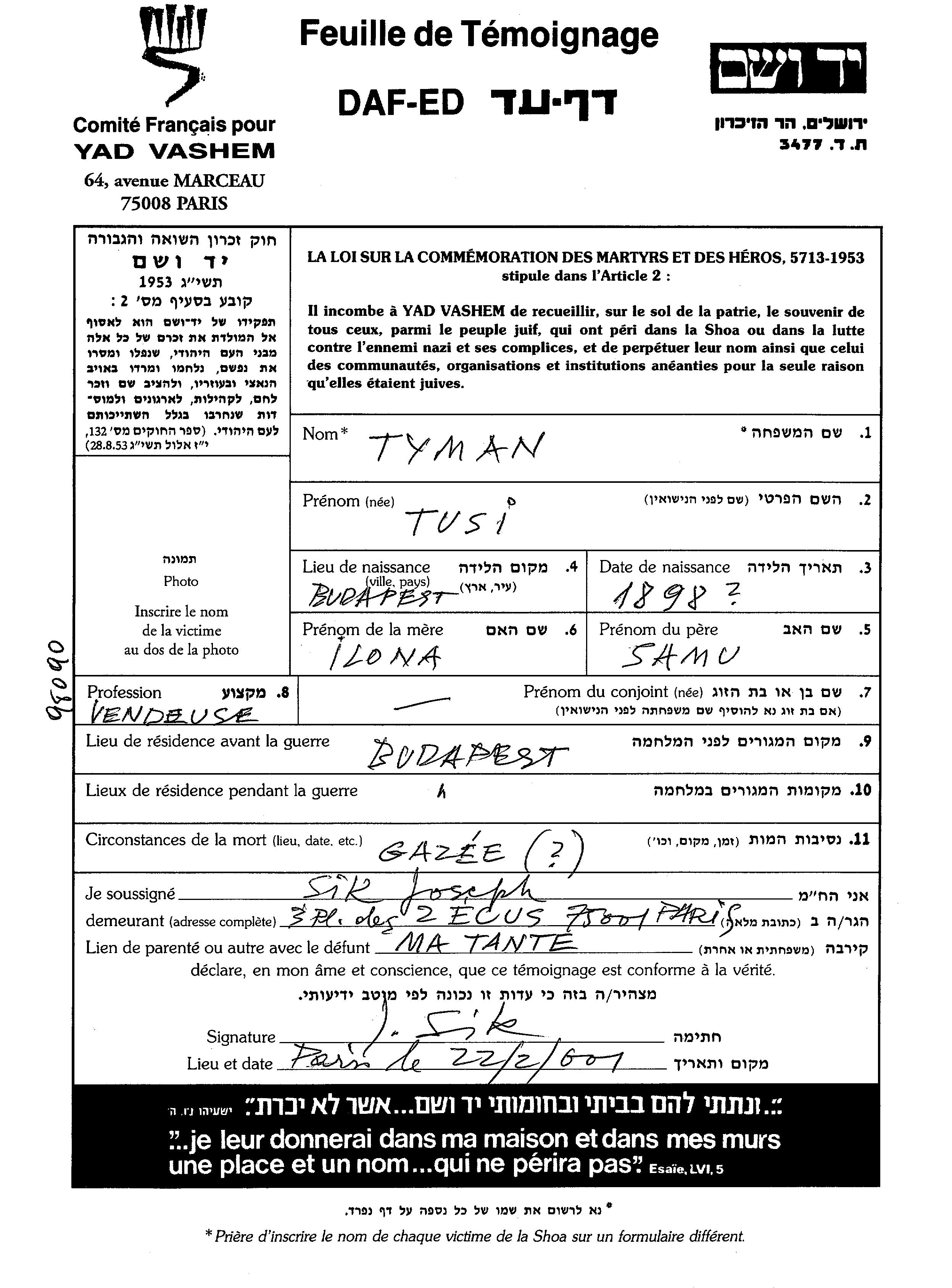 Tyman Tusi 1898 Budapest, Hongrie Feuille de témoignage
