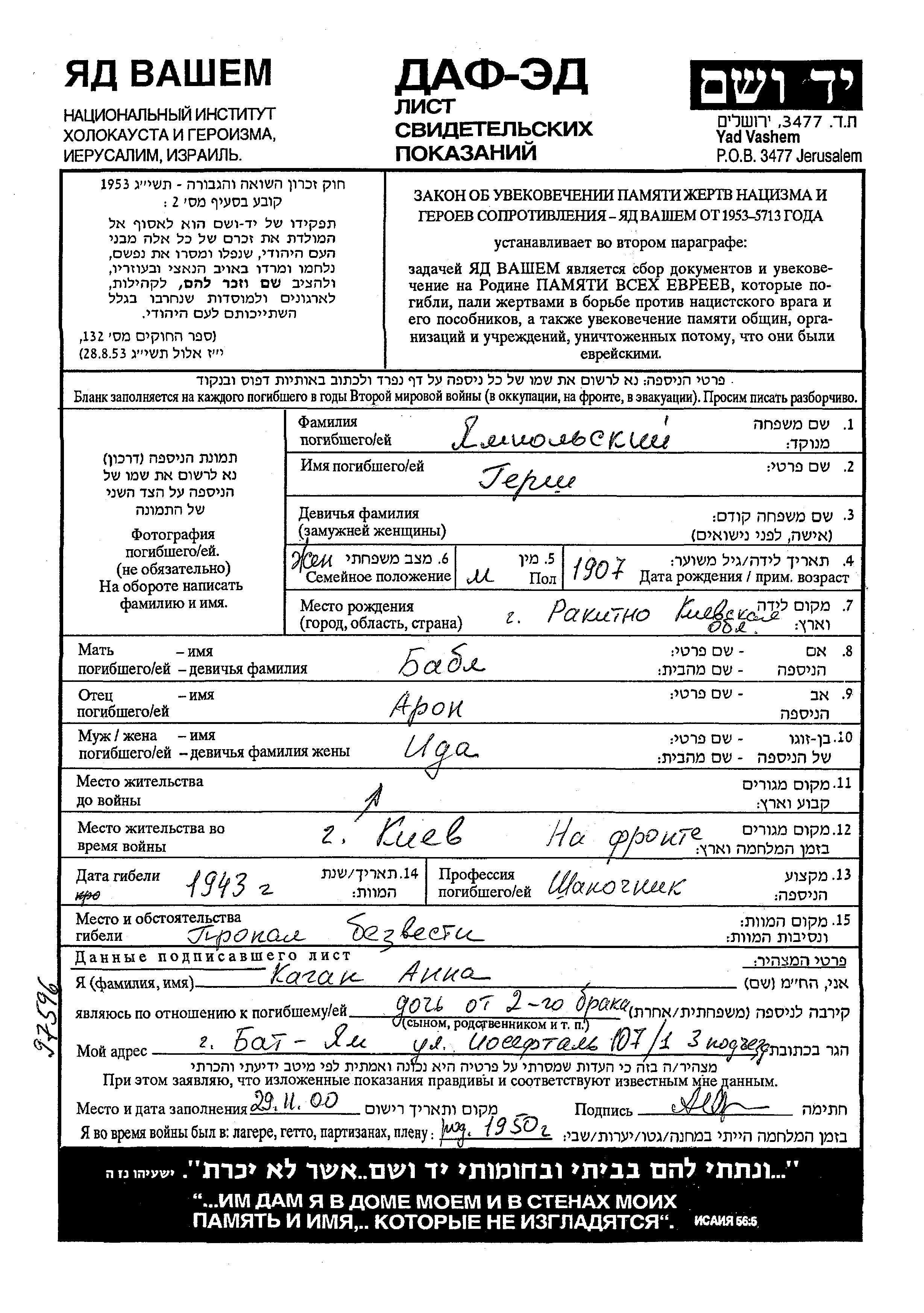 Yampolski Gersh 1907 Kiev, Ukraine (URSS) Feuille de témoignage