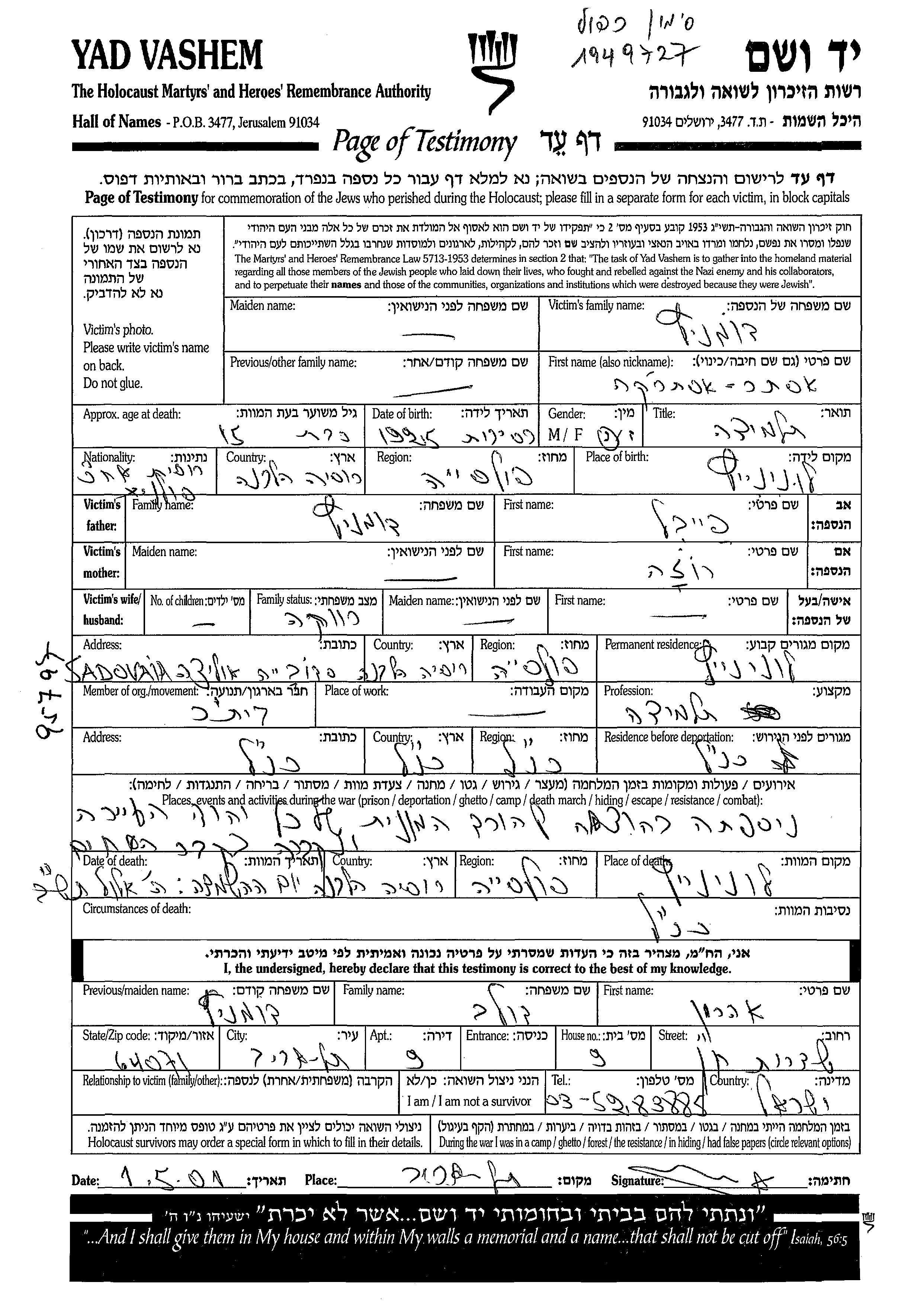 Yad Vashem - Pages of Testimony Names Memorial Collection