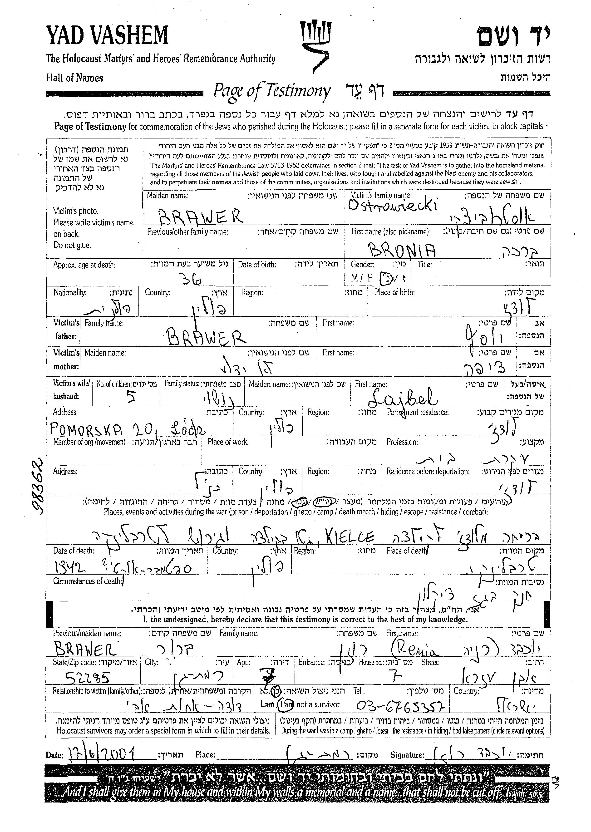 Ostrowiecki Bronia Brakha Lodz, Pologne Feuille de témoignage