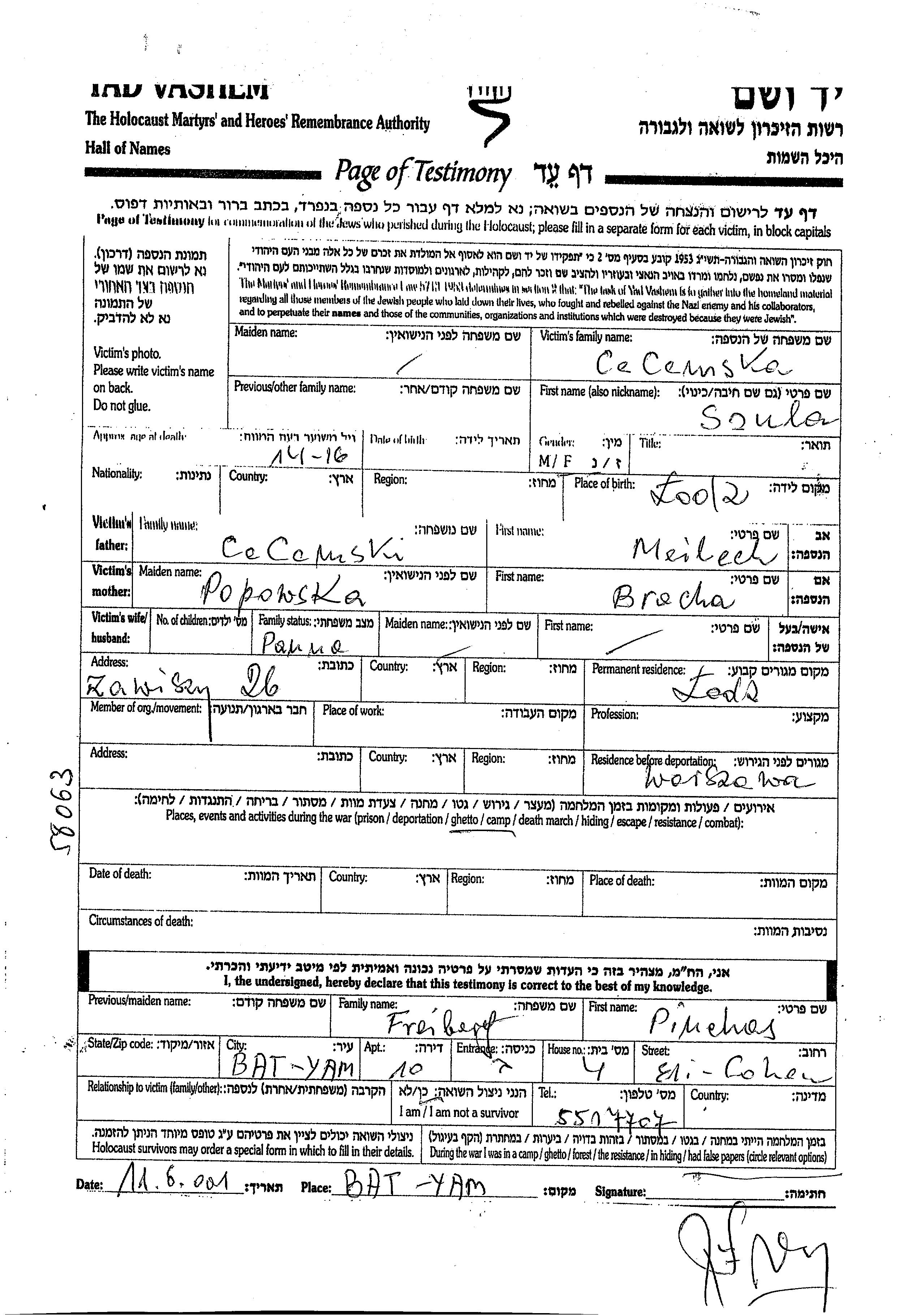 Yad Vashem - Pages of Testimony Names Memorial Collection