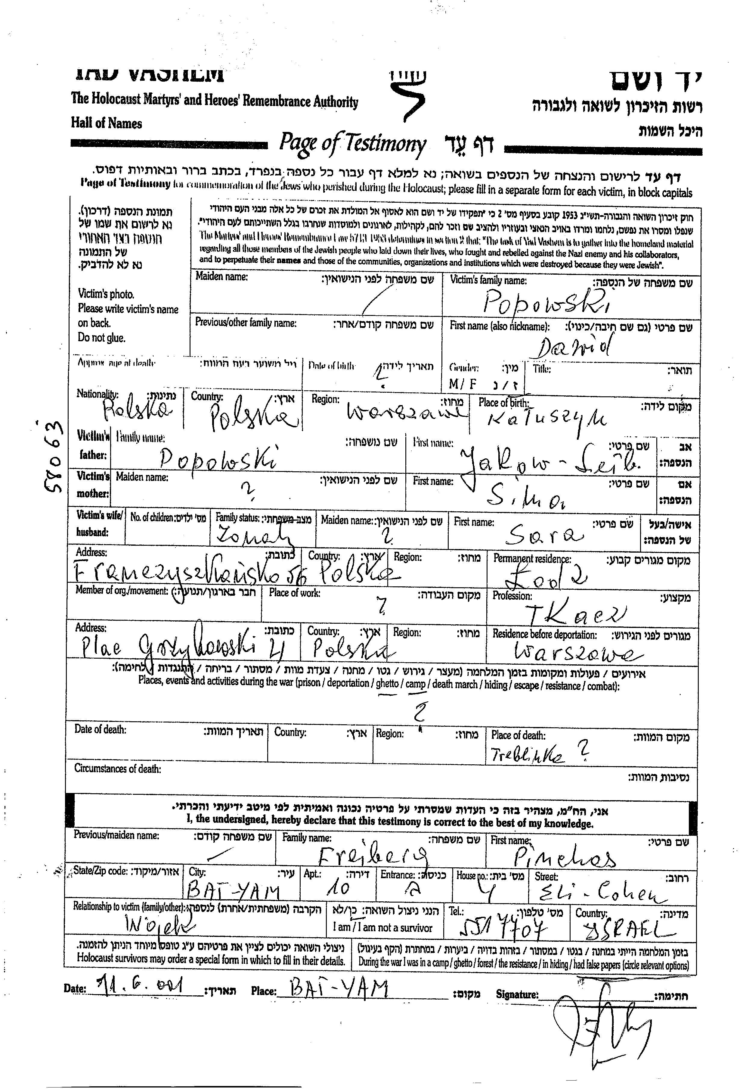 Popowski Dawid Lodz, Pologne Feuille de témoignage