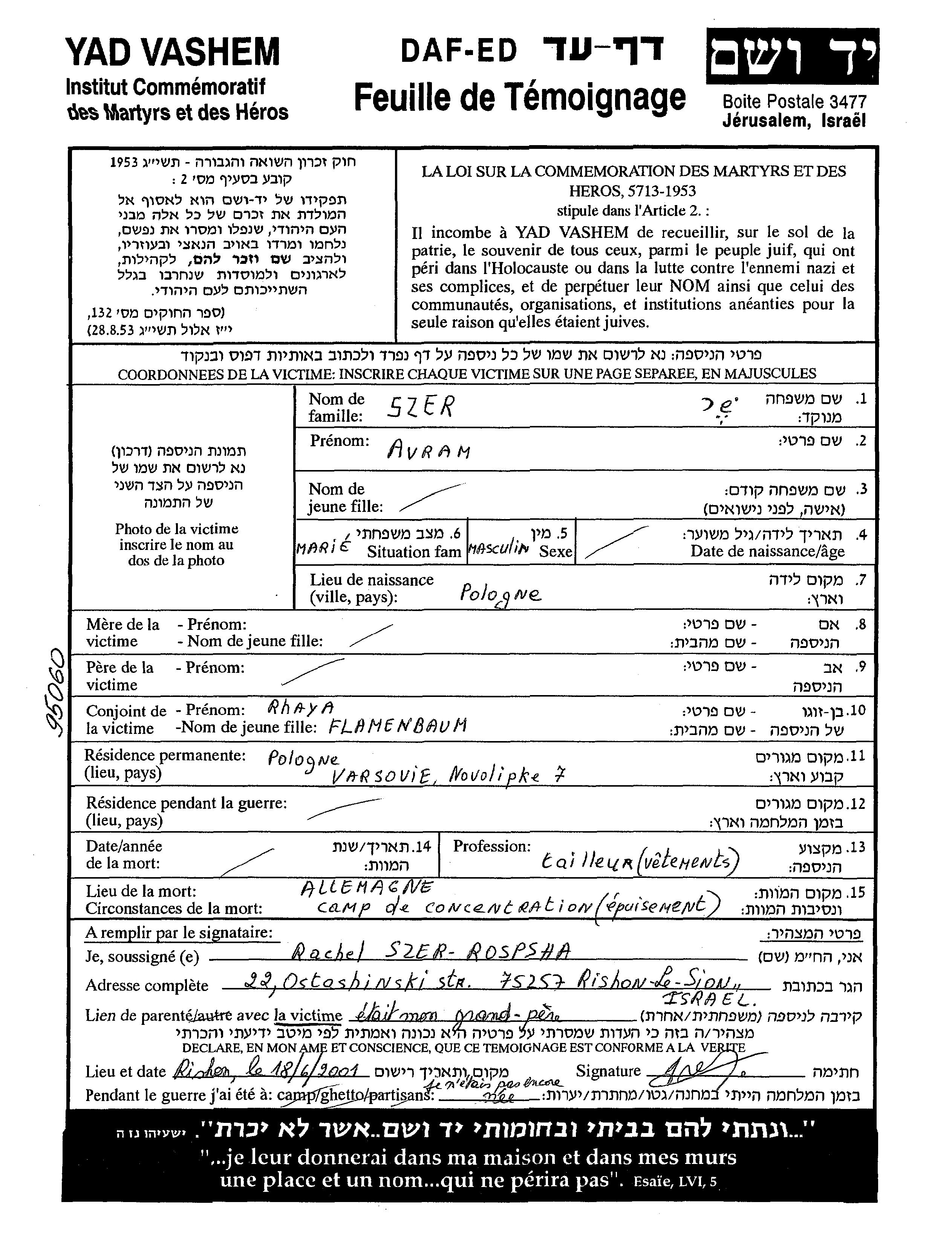 Szer Avram Varsovie, Pologne Feuille de témoignage