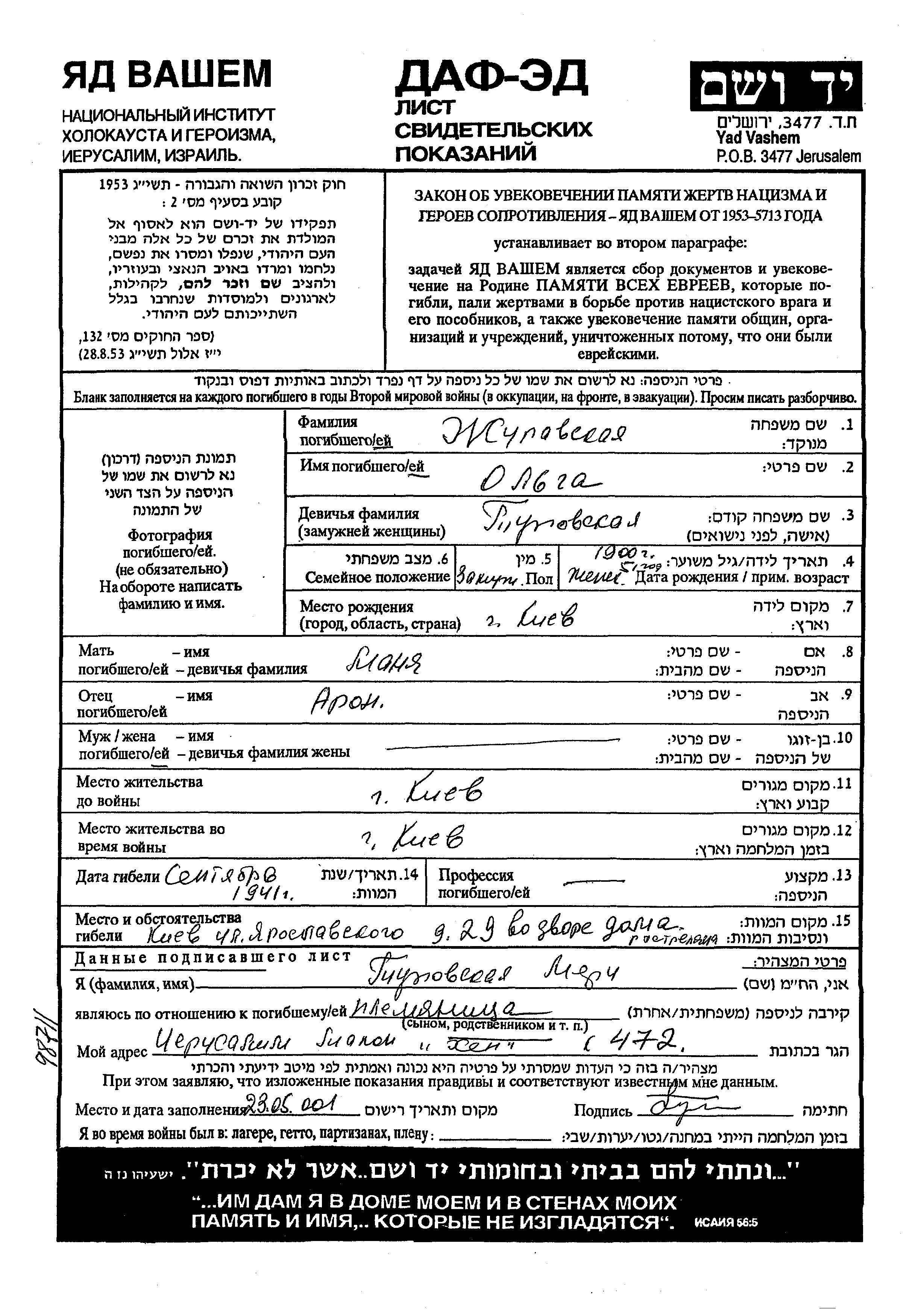 Yad Vashem - Pages of Testimony Names Memorial Collection
