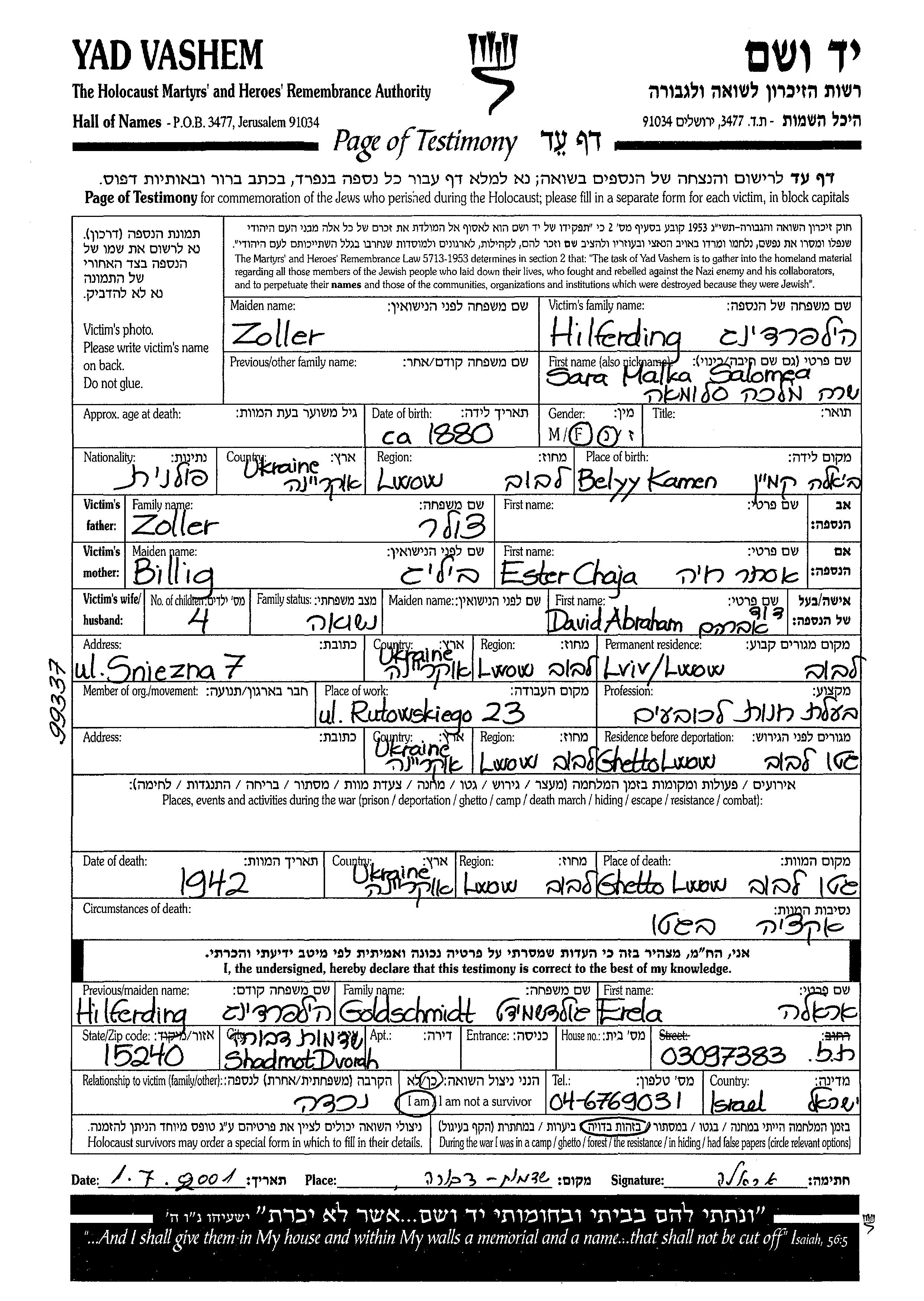 Salomea Sara Malka Hilferding née Zoller est née à Bely Kamen, Pologne en 1880, fille de Chaja Ester. Elle était Hat store owner et Mariée à Abraham David. Avant la seconde guerre mondiale elle vivait à Lwow, Pologne. Pendant la guerre, elle était à Lwow, Pologne.