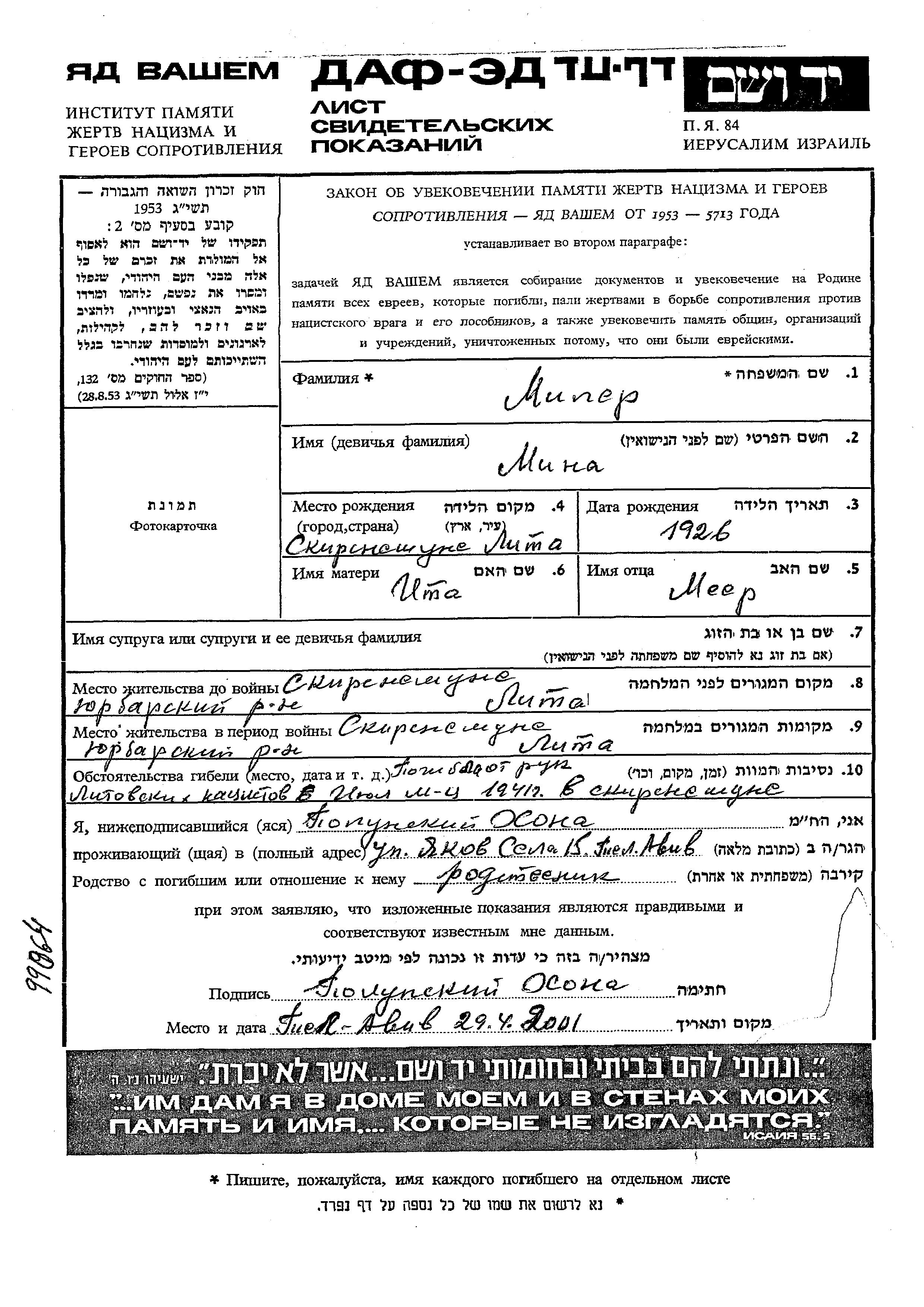 Miler Mina 1926 Skirsnemune, Lituanie Feuille de témoignage