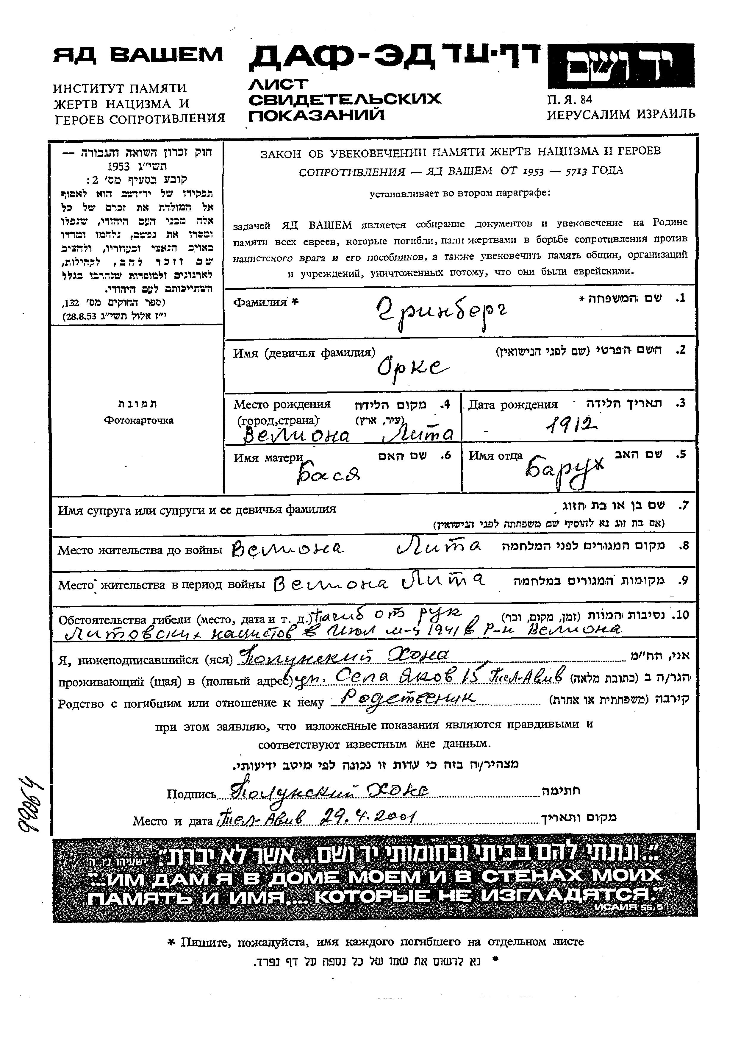 Grinberg Orke 1912 Veliona, Lituanie Feuille de témoignage