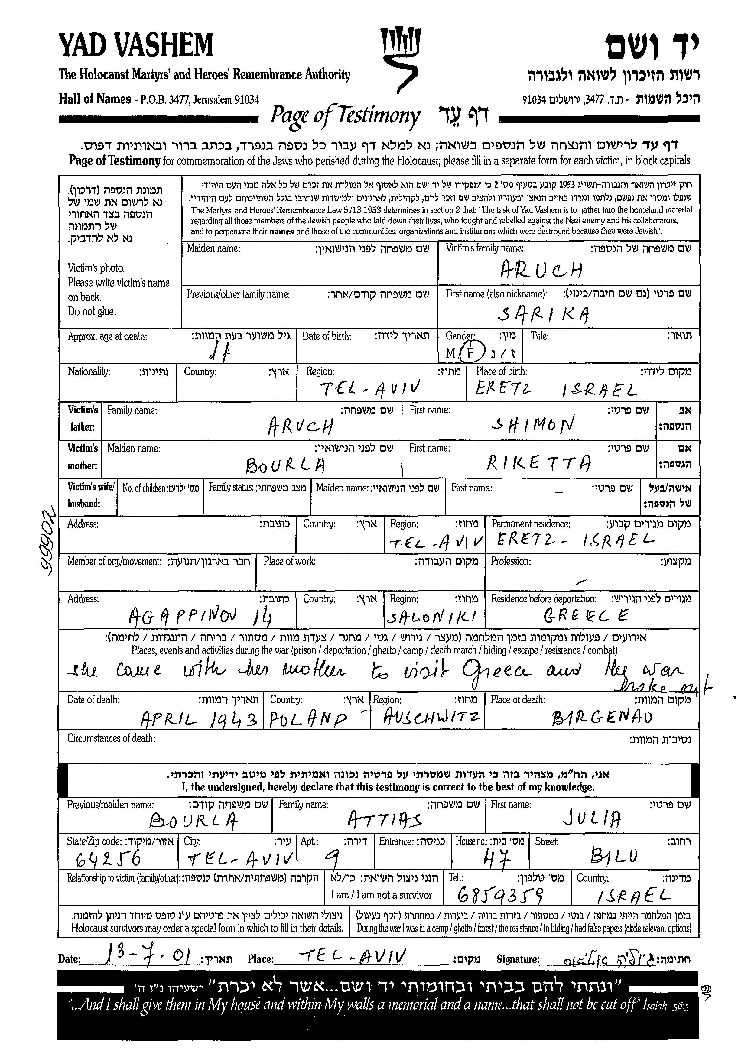Sarika Aruch est née à Tel Aviv, Palestine sous mandat britanique, fille de Shimon et de Riketta. Elle était Enfant. Avant la seconde guerre mondiale elle vivait à Tel Aviv, Palestine sous mandat britanique. Pendant la guerre, elle était à Saloniki, Grèce.