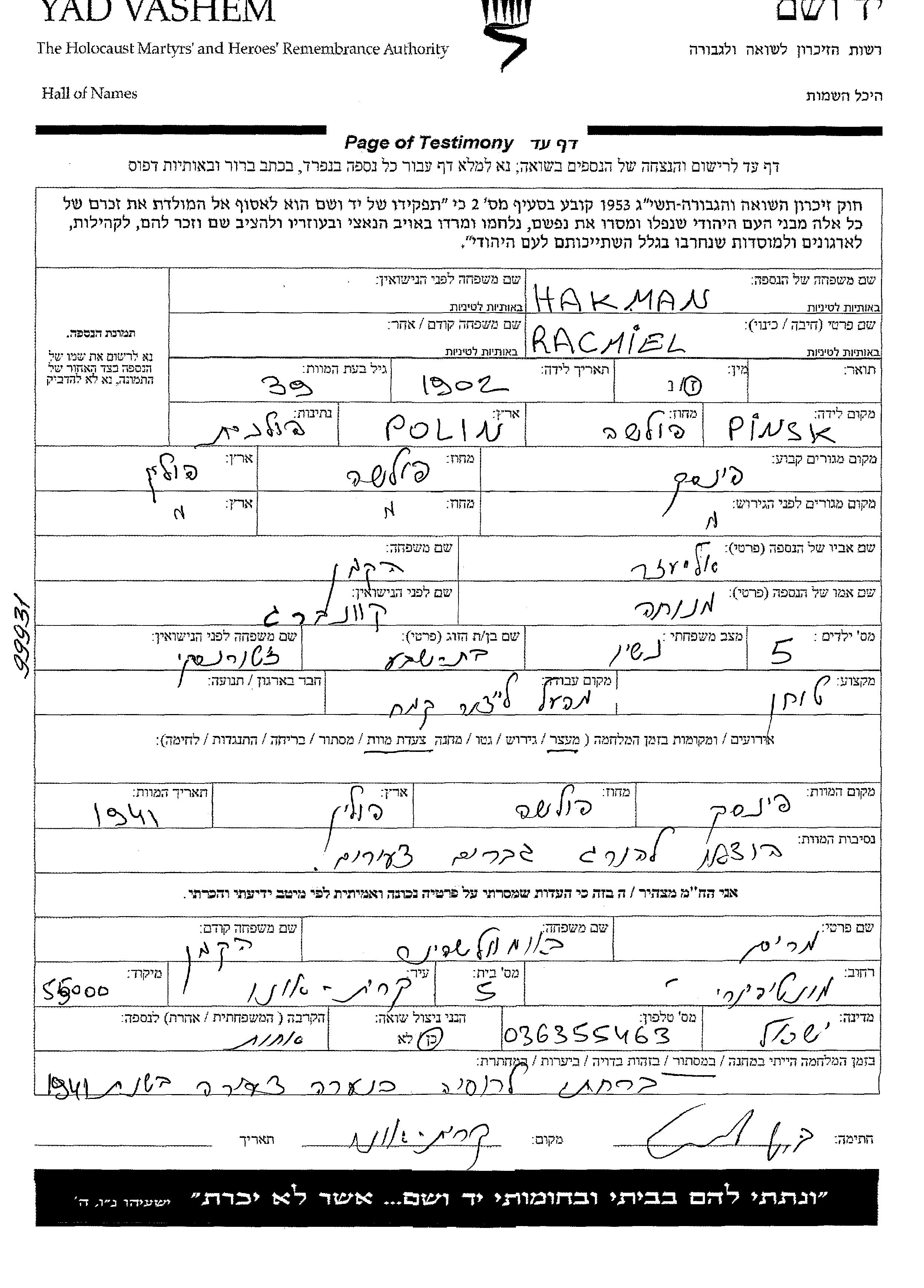 Hakman Racmiel 1902 Pinsk, Pologne Feuille de témoignage