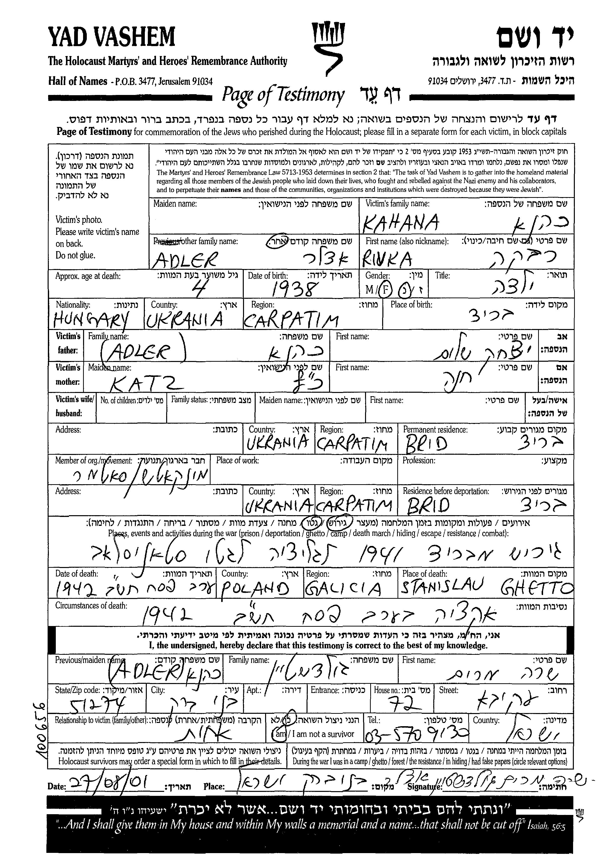 Kahana Adler Rivka 1938 Brod, Tchécoslovaquie Feuille de témoignage