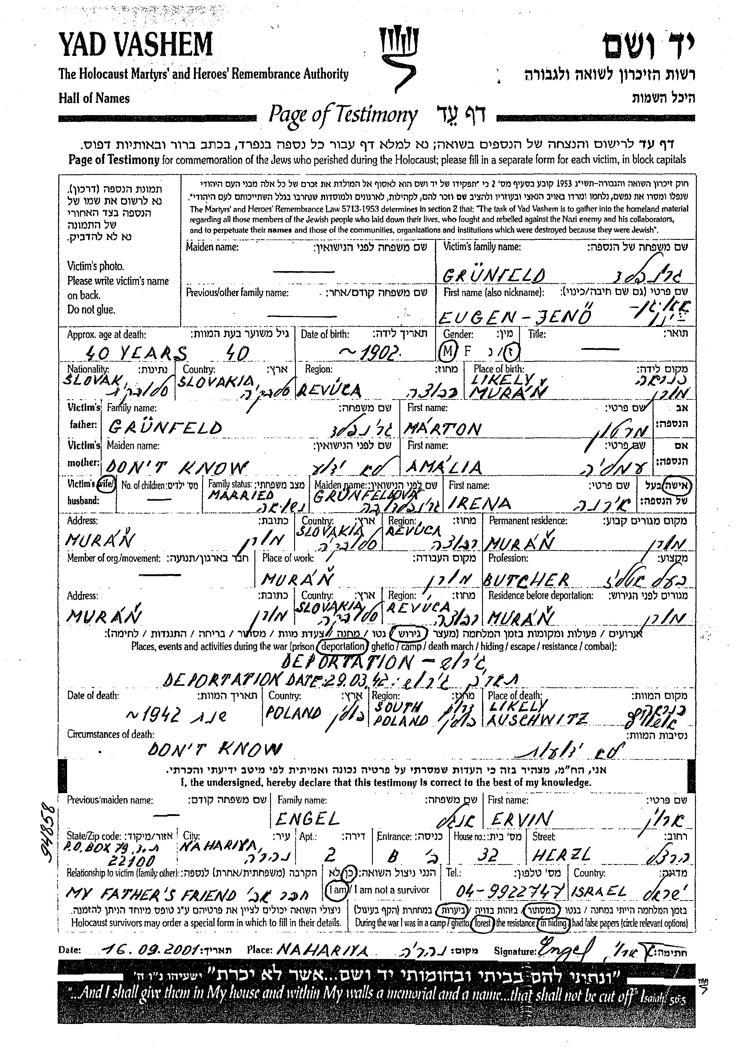 Gruenfeld Jeno Eugen 1902 Muran, Tchécoslovaquie Feuille de témoignage