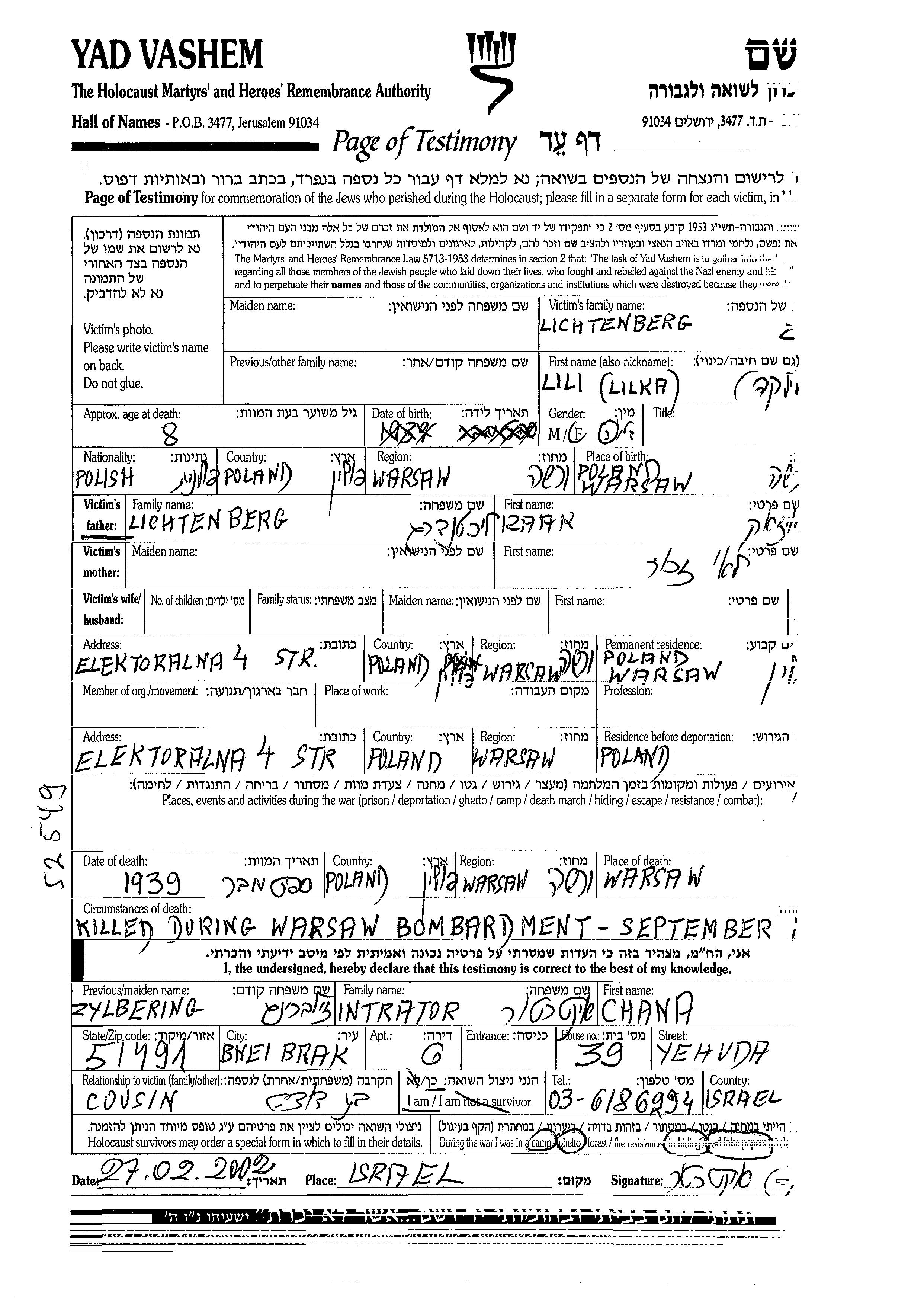 Lichtenberg Lili Warszawa, Pologne Feuille de témoignage