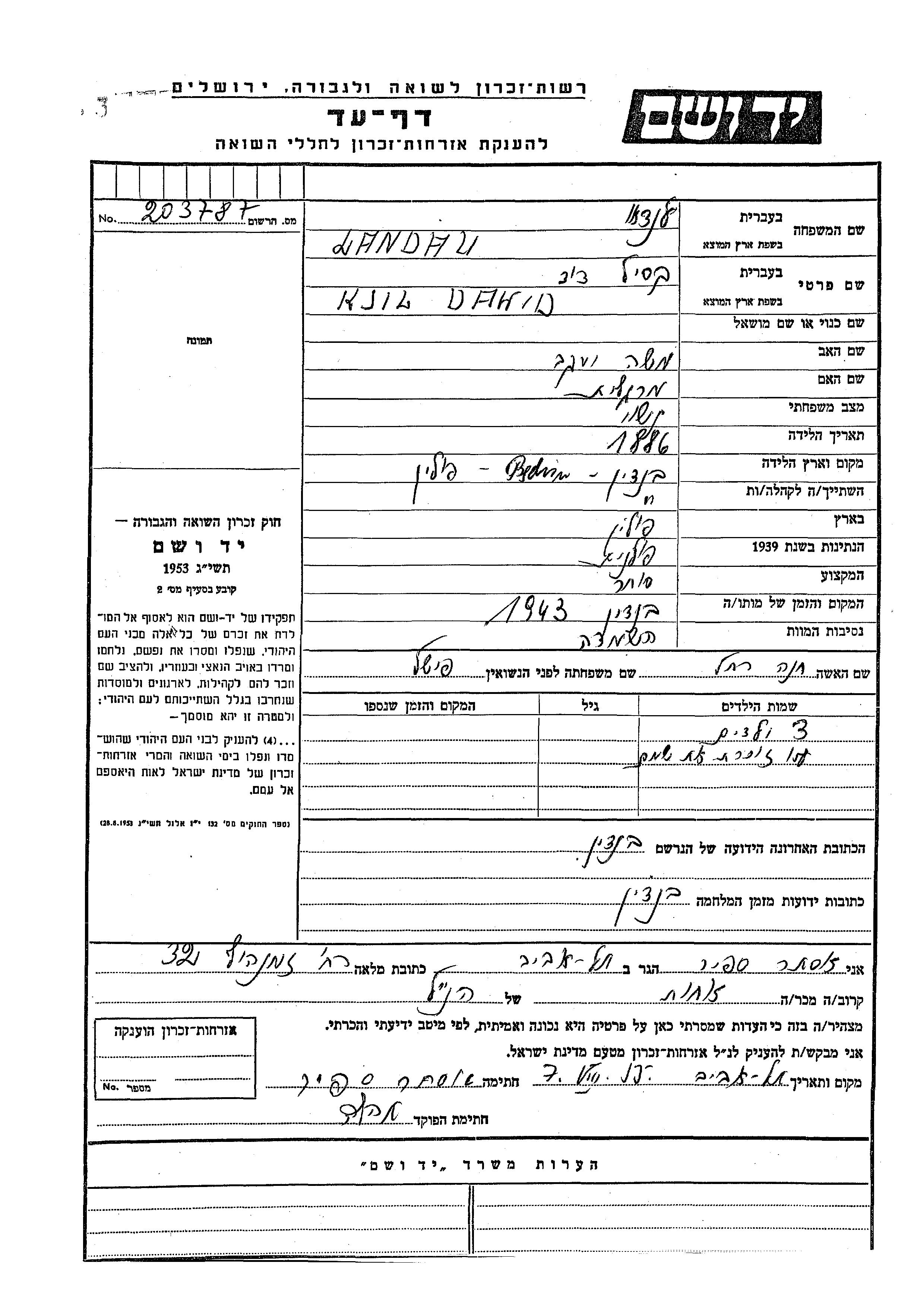 Ksil David Landau est né à Bendin, Pologne en 1886, fils de Moshe Yaakov et de Margalit. Il était Commerçant/e et Mariée à Khana Rakhel née Fishel. Avant la seconde guerre mondiale il vivait à Pologne. Au cours de la guerre, il était à Bendin, Pologne.