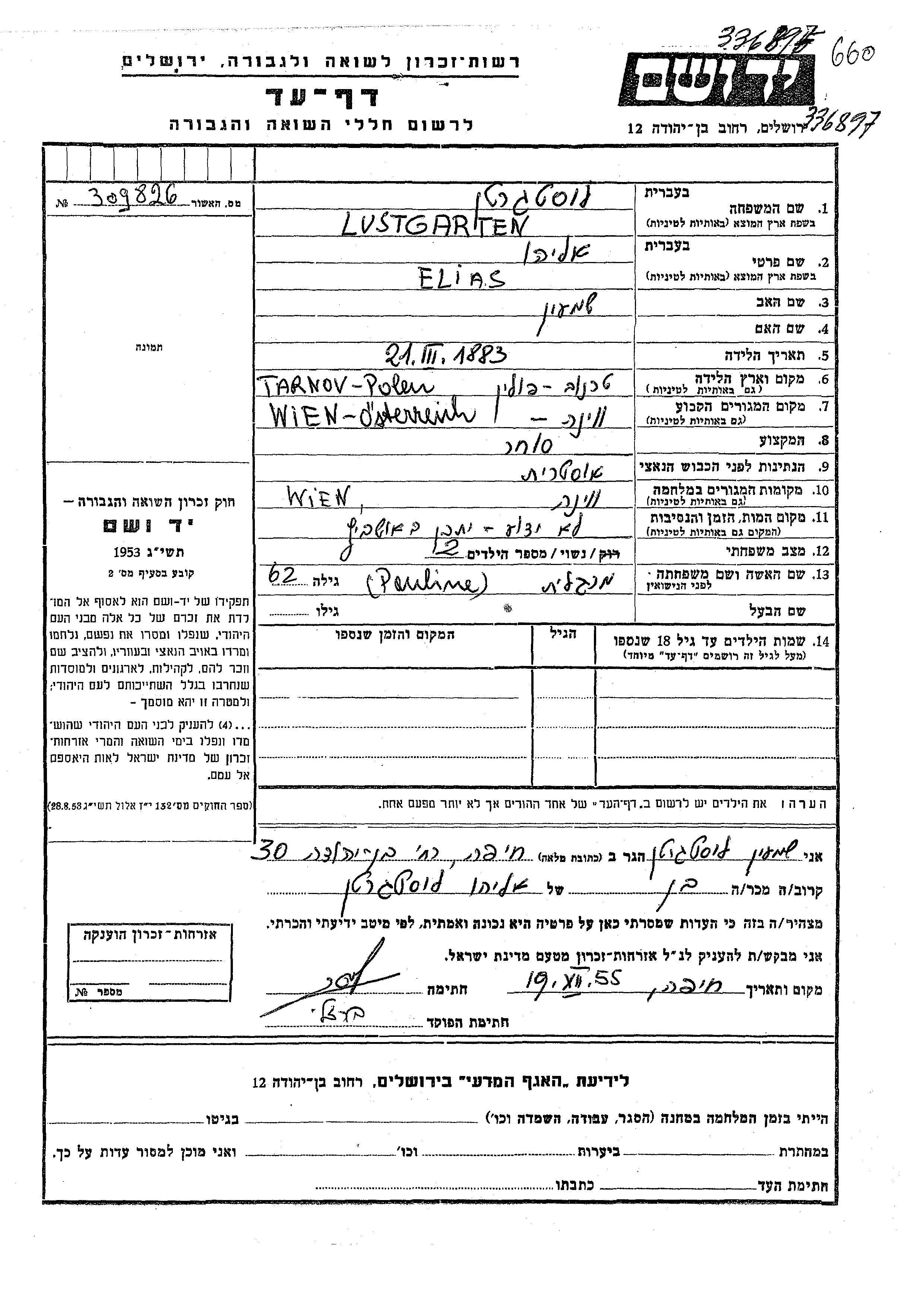 Elias Lustgarten est né à Tarnow, Pologne en 1883, fils de Shimon. Il était Commerçant/e et Mariée à Margalit. Avant la seconde guerre mondiale il vivait à Wien, Autriche. Au cours de la guerre, il était à Wien, Autriche.