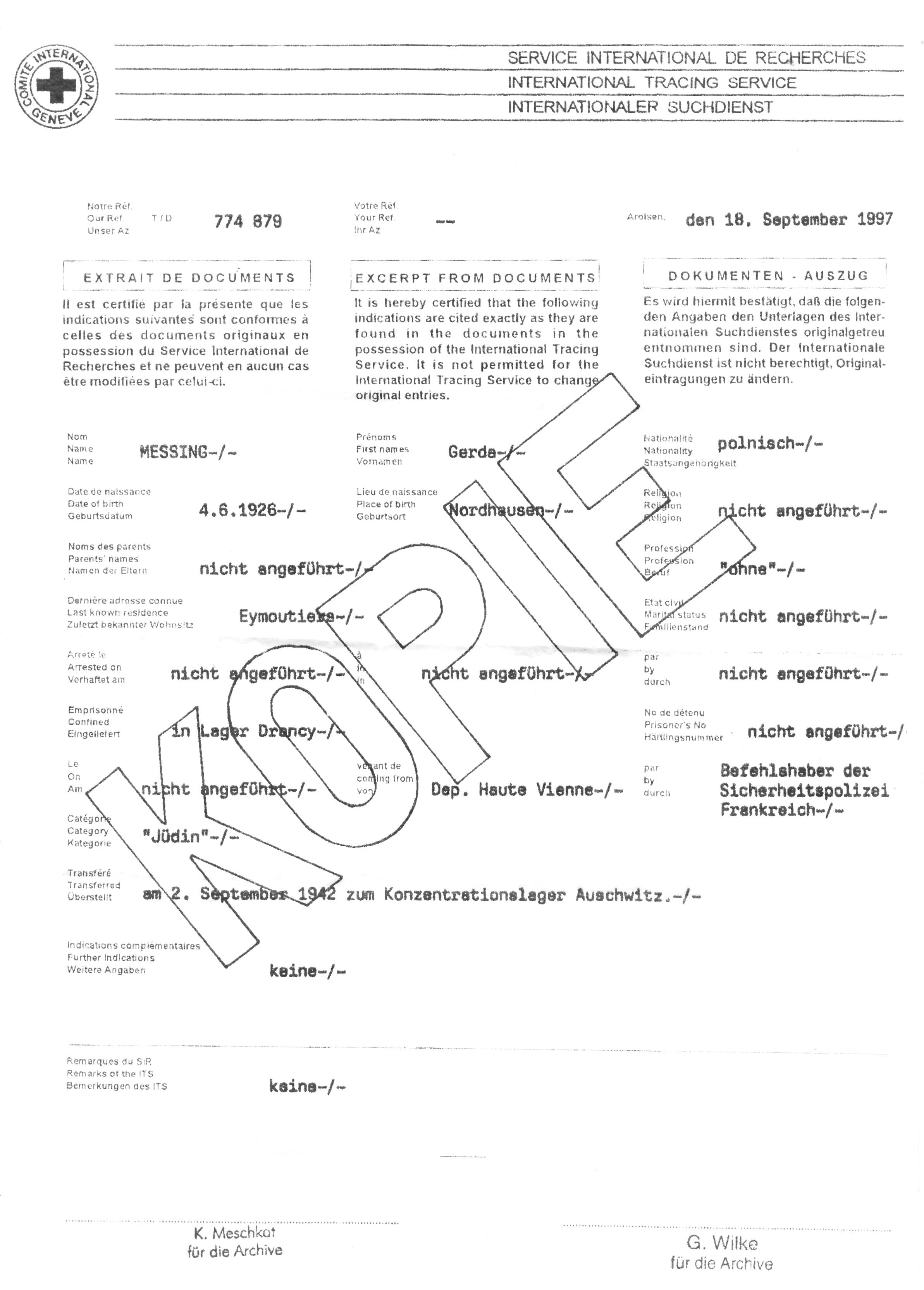 | Messing | Gerda | 1926 | Nordhausen, Allemagne | Feuille de témoignage |