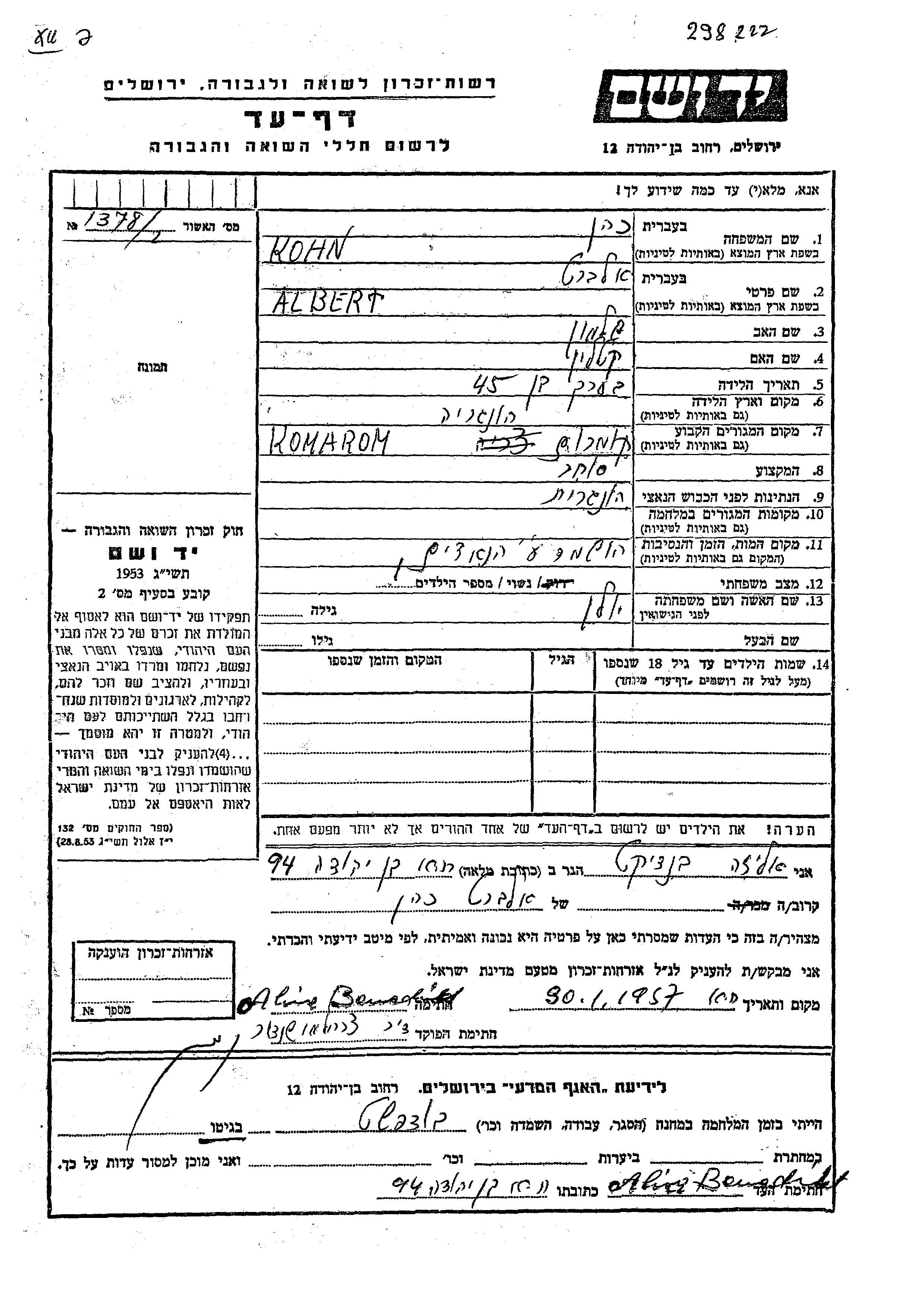 Kohn Albert Komarom, Hongrie Feuille de témoignage