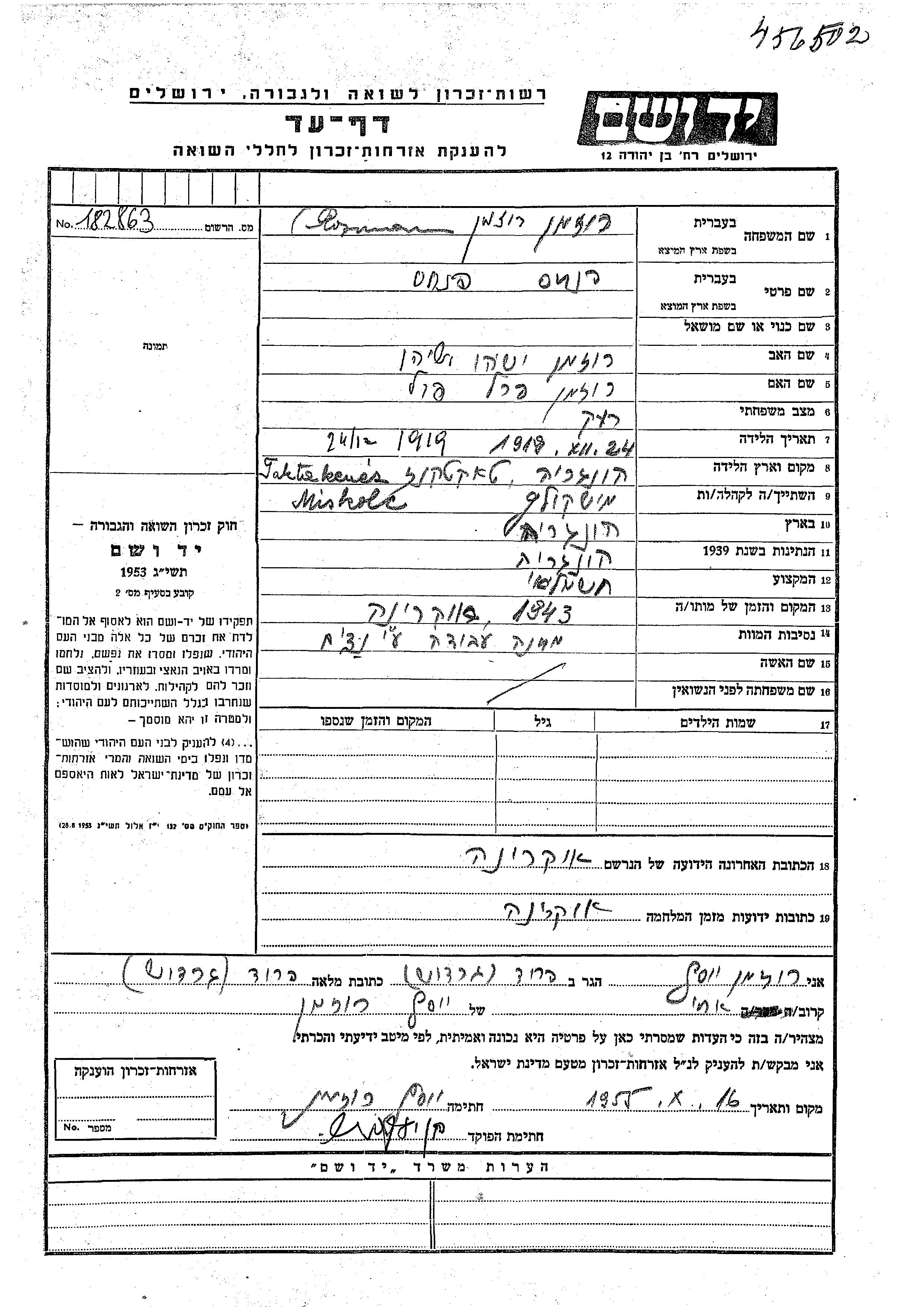 Rosman Rozman Pinkhas 1919 Miskolc, Hongrie Feuille de témoignage