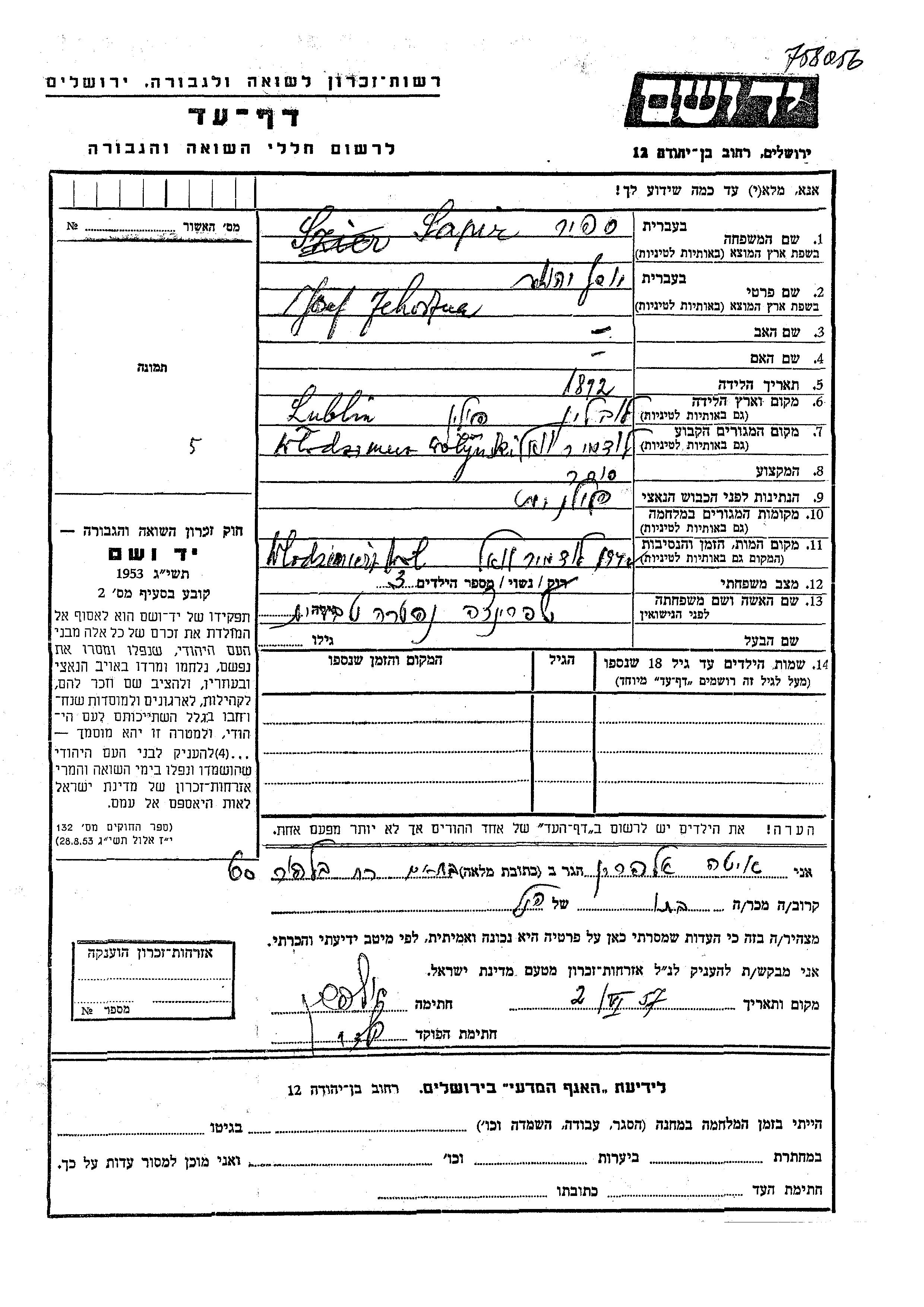 Sapir Josef Jehoshua 1892 Wlodmer, Pologne Feuille de témoignage
