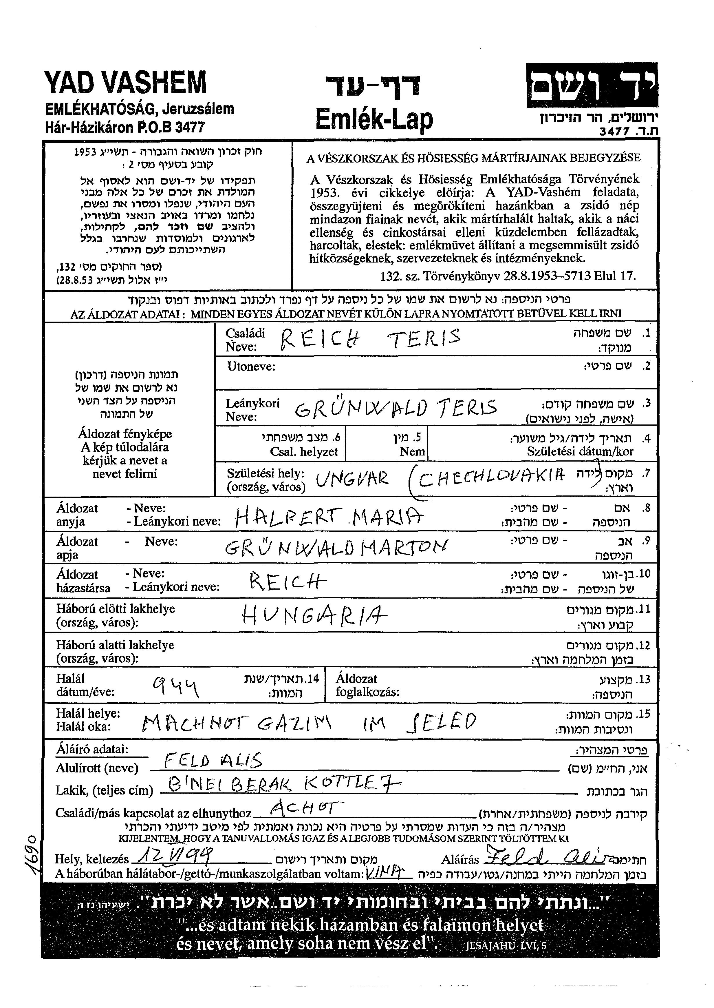 Teris Reich née Grünwald est née à Ungvar, Tchécoslovaquie, fille de Marton et de Maria née Halpert. Avant la seconde guerre mondiale elle vivait à Hongrie.