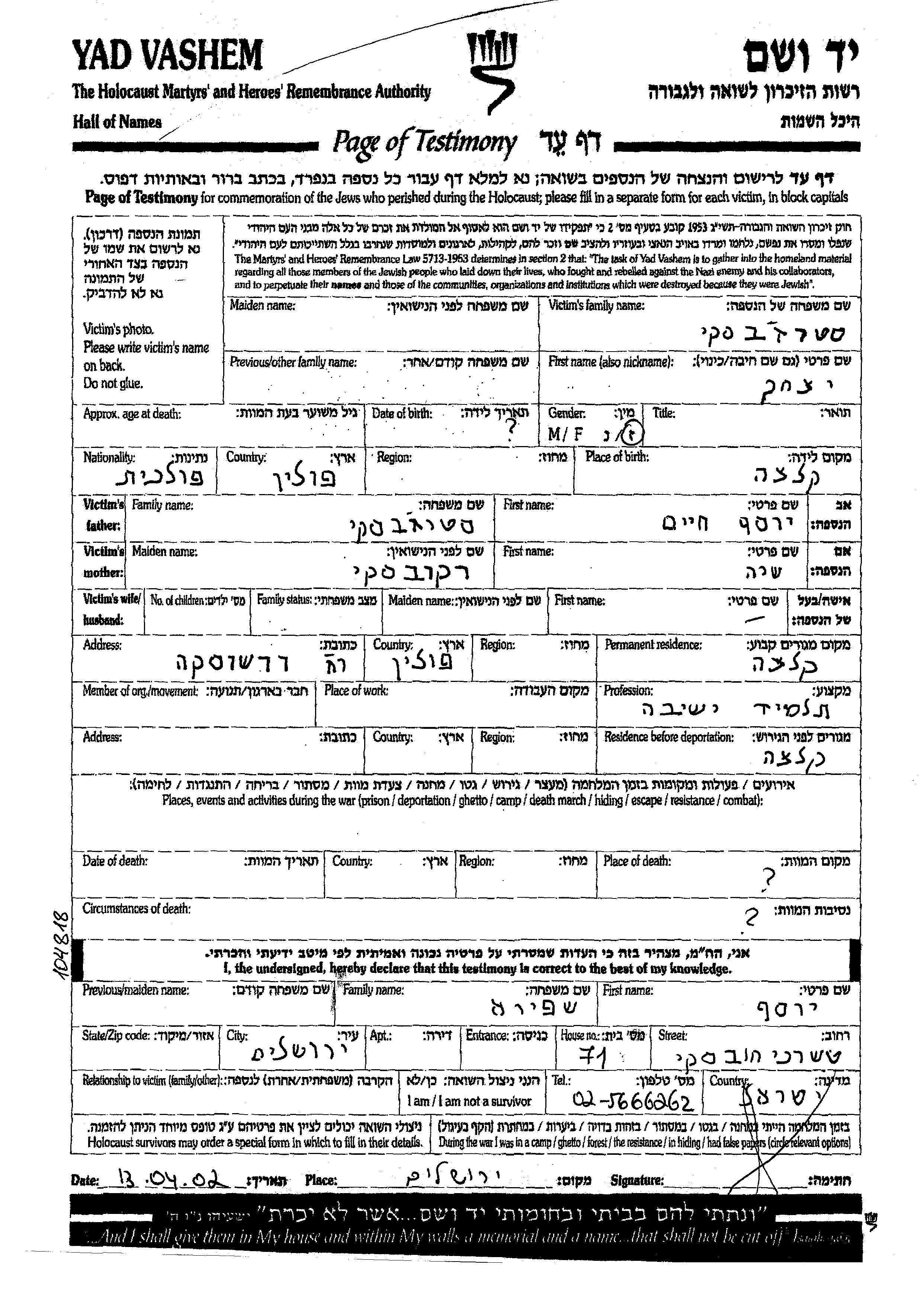 Yad Vashem - Pages of Testimony Names Memorial Collection