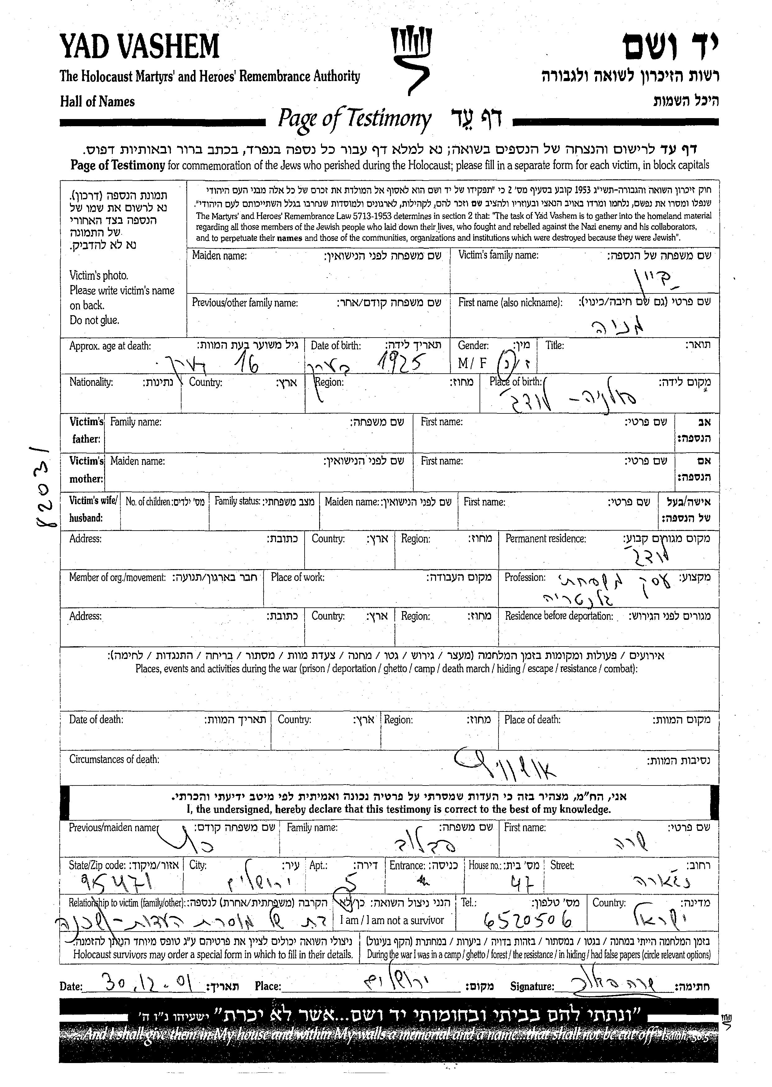 Yad Vashem - Pages of Testimony Names Memorial Collection
