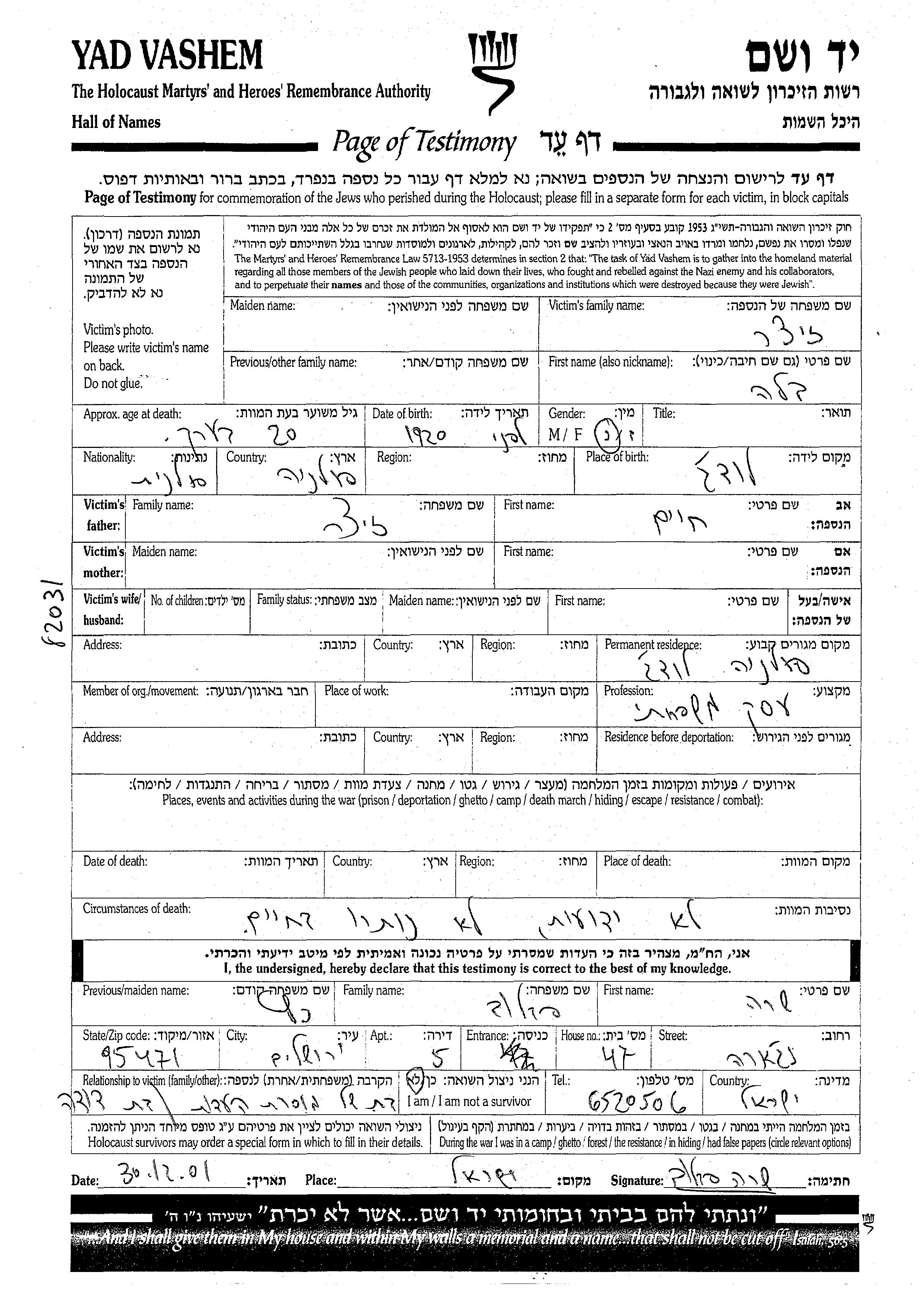 Yad Vashem - Pages of Testimony Names Memorial Collection