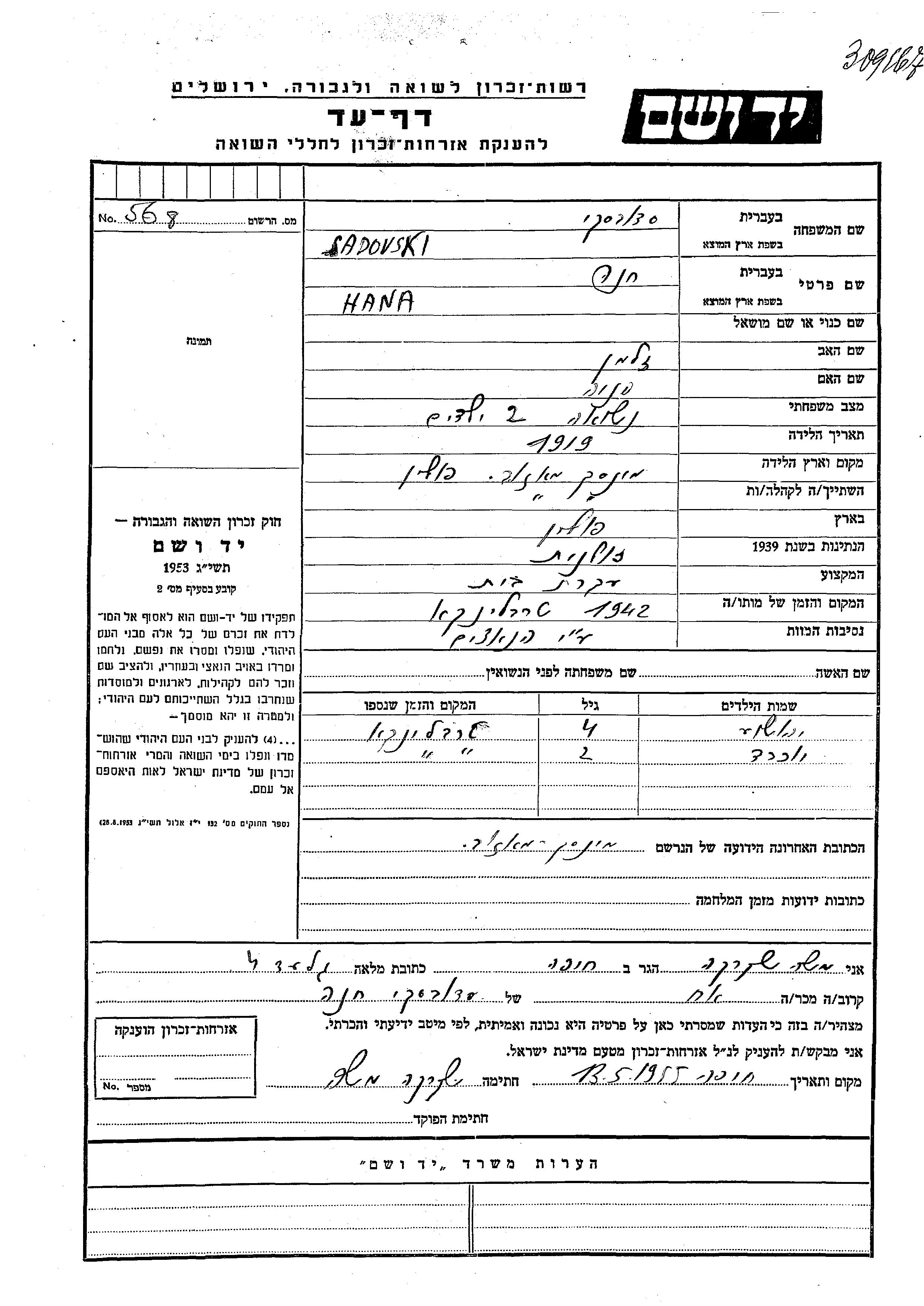 Sadovski Hana 1919 endroit inconnu, Feuille de témoignage