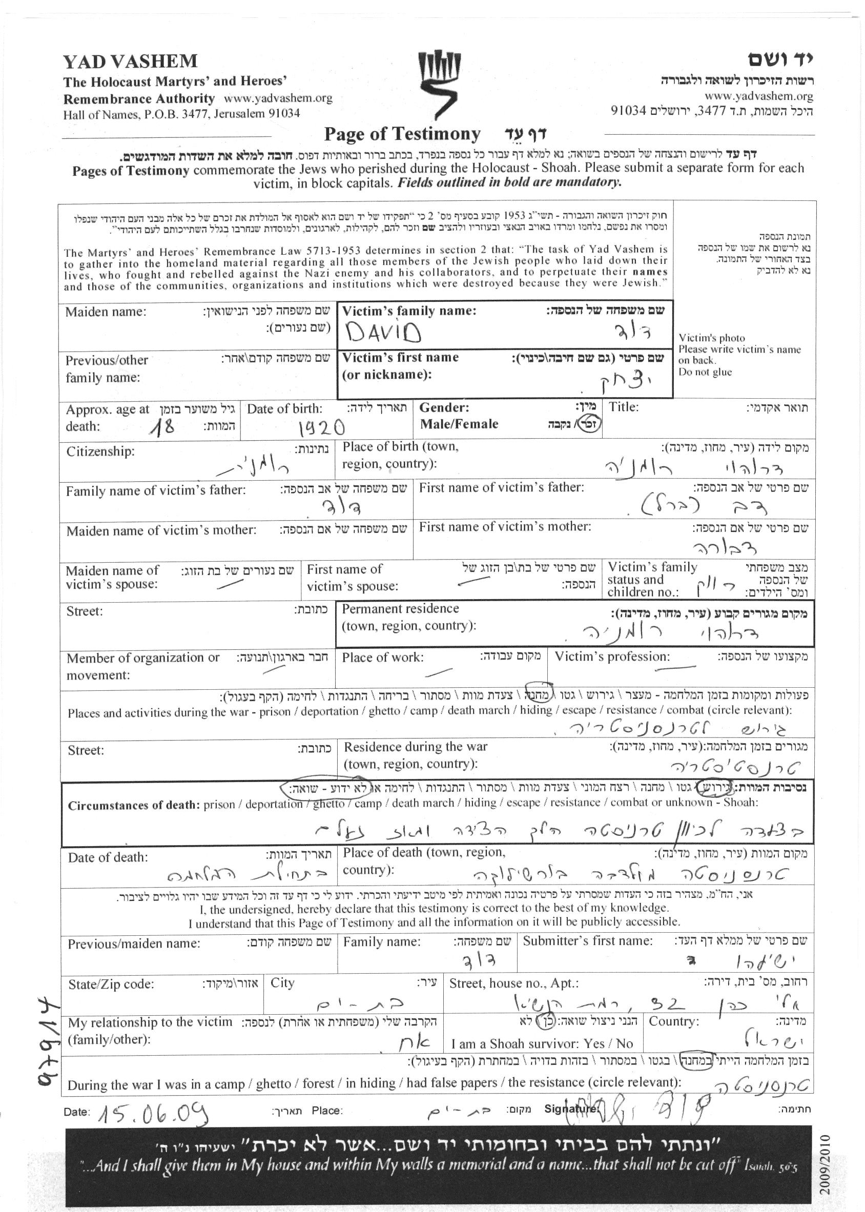 David Yitzkhak 1920 Dorohoi, Roumanie Feuille de témoignage
