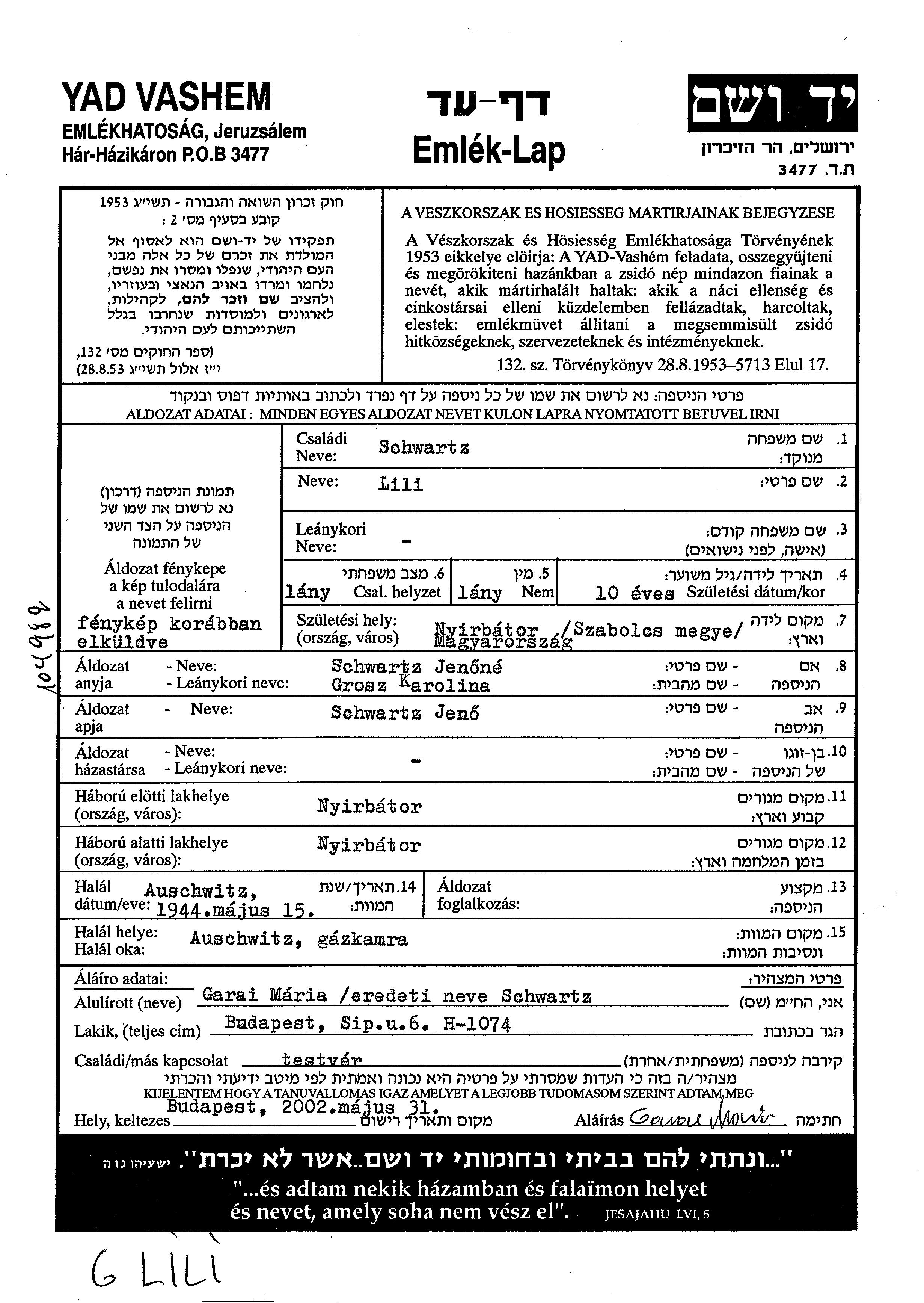 Schwartz Lili Nyirbator, Hongrie Feuille de témoignage