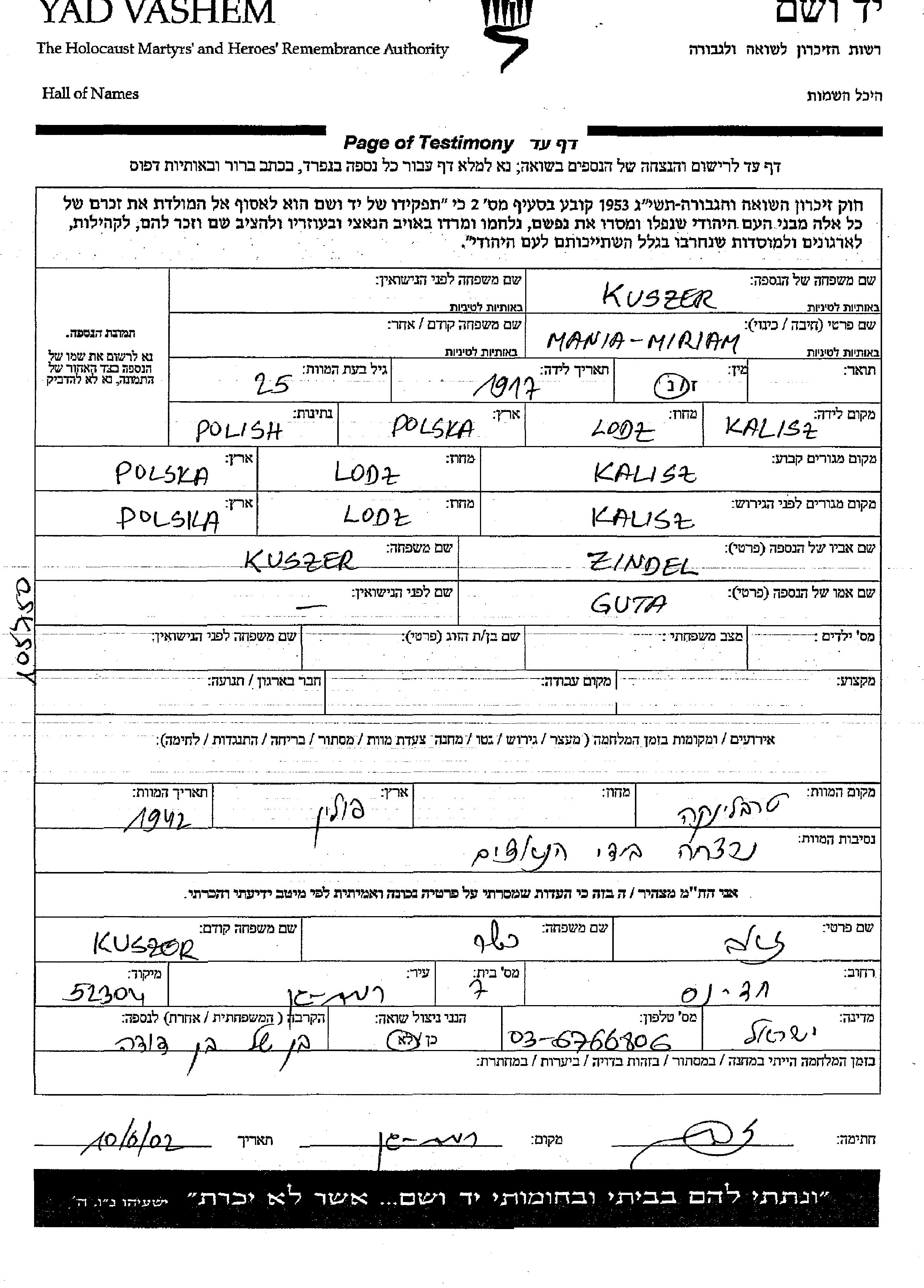 Kuszer Mania Miriam 1917 Kalisz, Pologne Feuille de témoignage