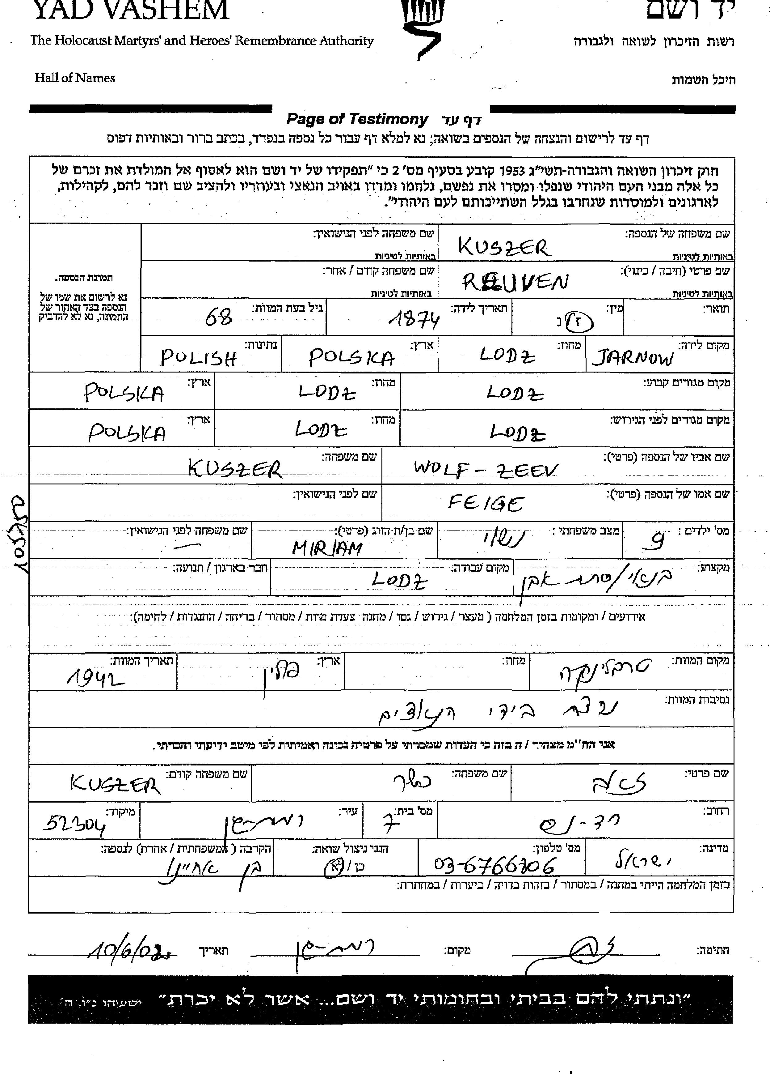 Reuven Kuszer est né à Jarnow, Pologne en 1874, fils de Wolf Zeev et de Feiga. Il était Ouvrier du bâtiment et Mariée à Miriam. Avant la seconde guerre mondiale il vivait à Lodz, Pologne. Au cours de la guerre, il était à Lodz, Pologne.