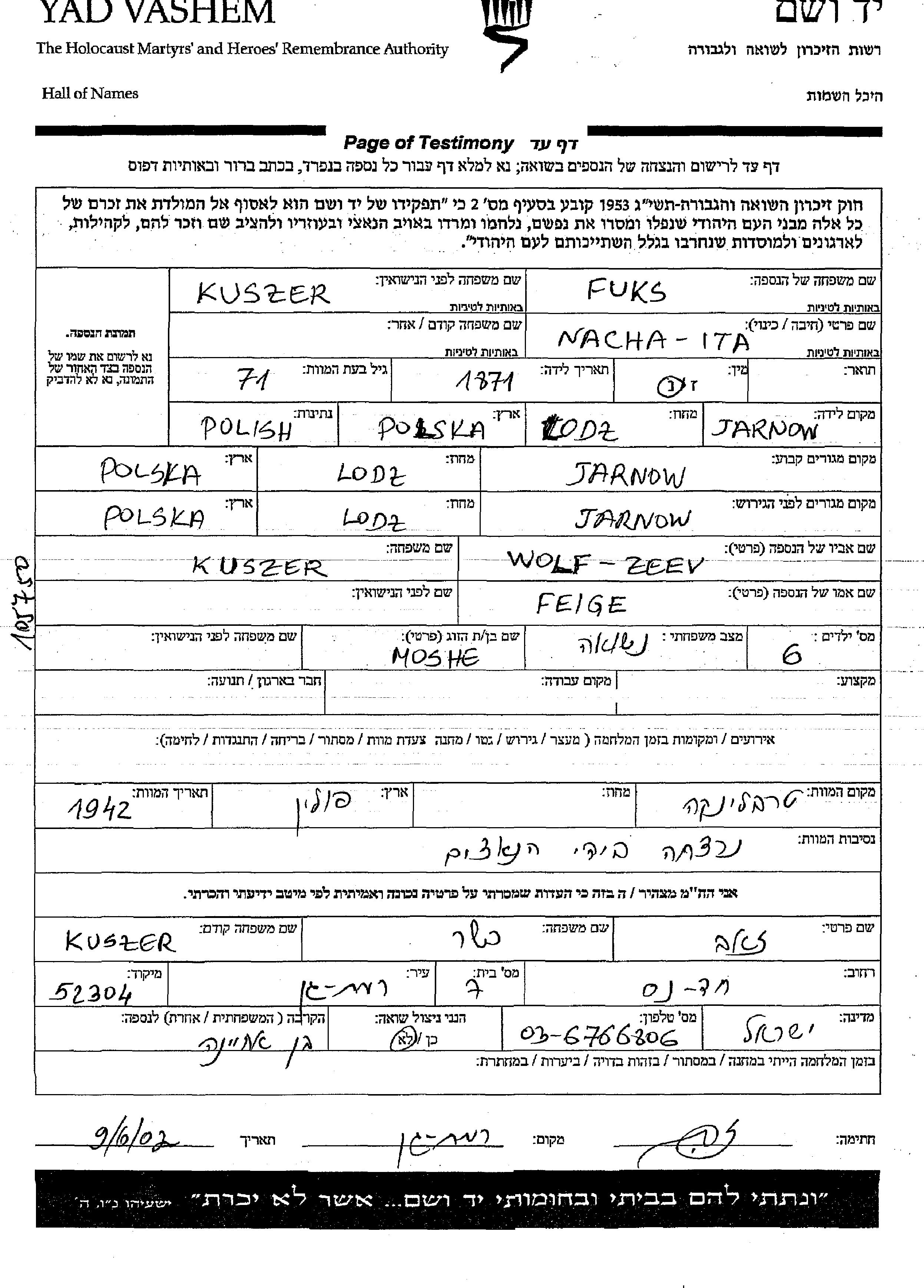 Nacha Ita Fuks née Kuszer est née à Jarnow, Pologne en 1871, fille de Wolf Zeev et de Feiga. Elle était Mariée à Moshe. Avant la seconde guerre mondiale elle vivait à Jarnow, Pologne. Pendant la guerre, elle était à Jarnow, Pologne.