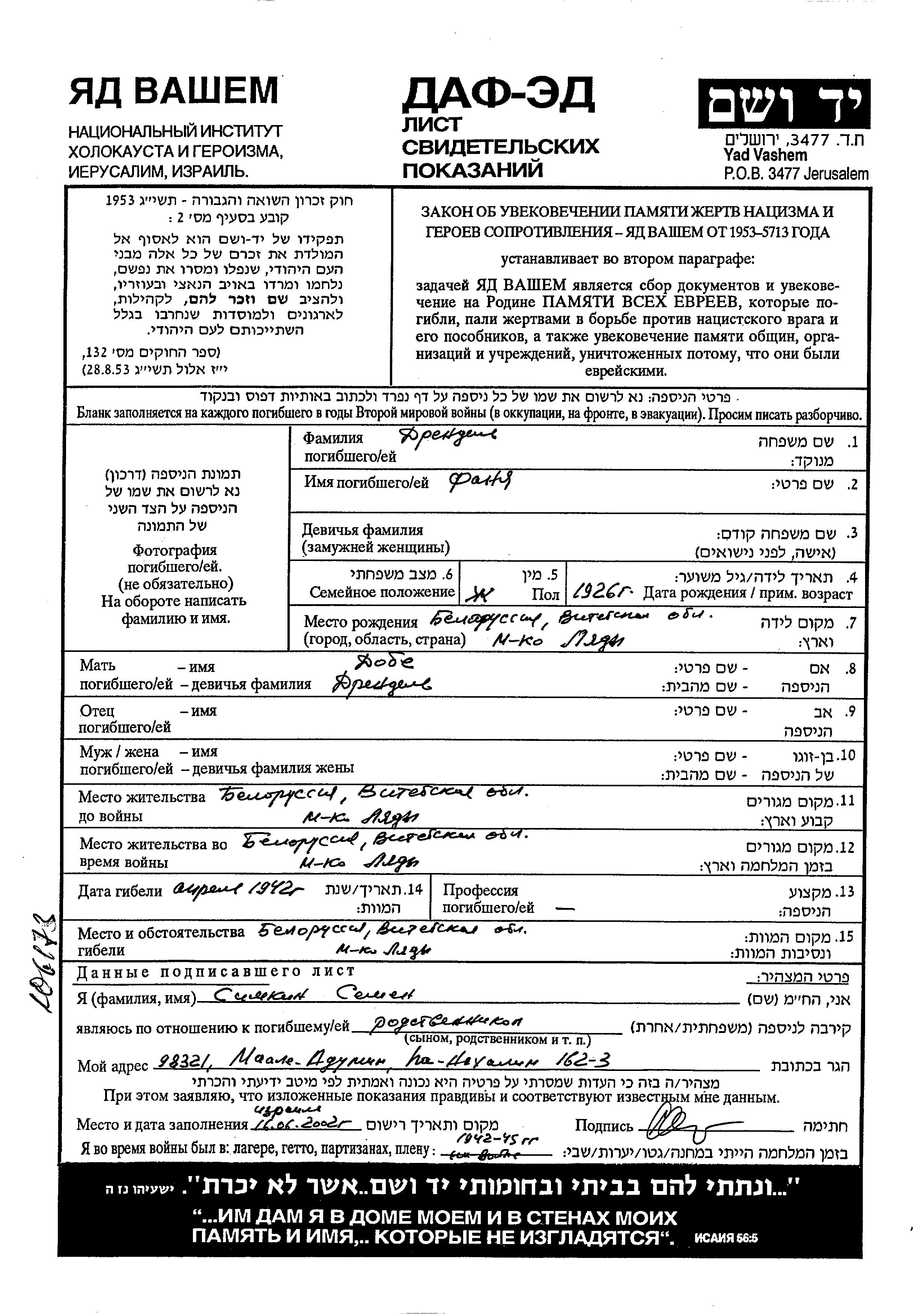 Drendel Fanya 1926 Lyady, Bélorussie (URSS) Feuille de témoignage