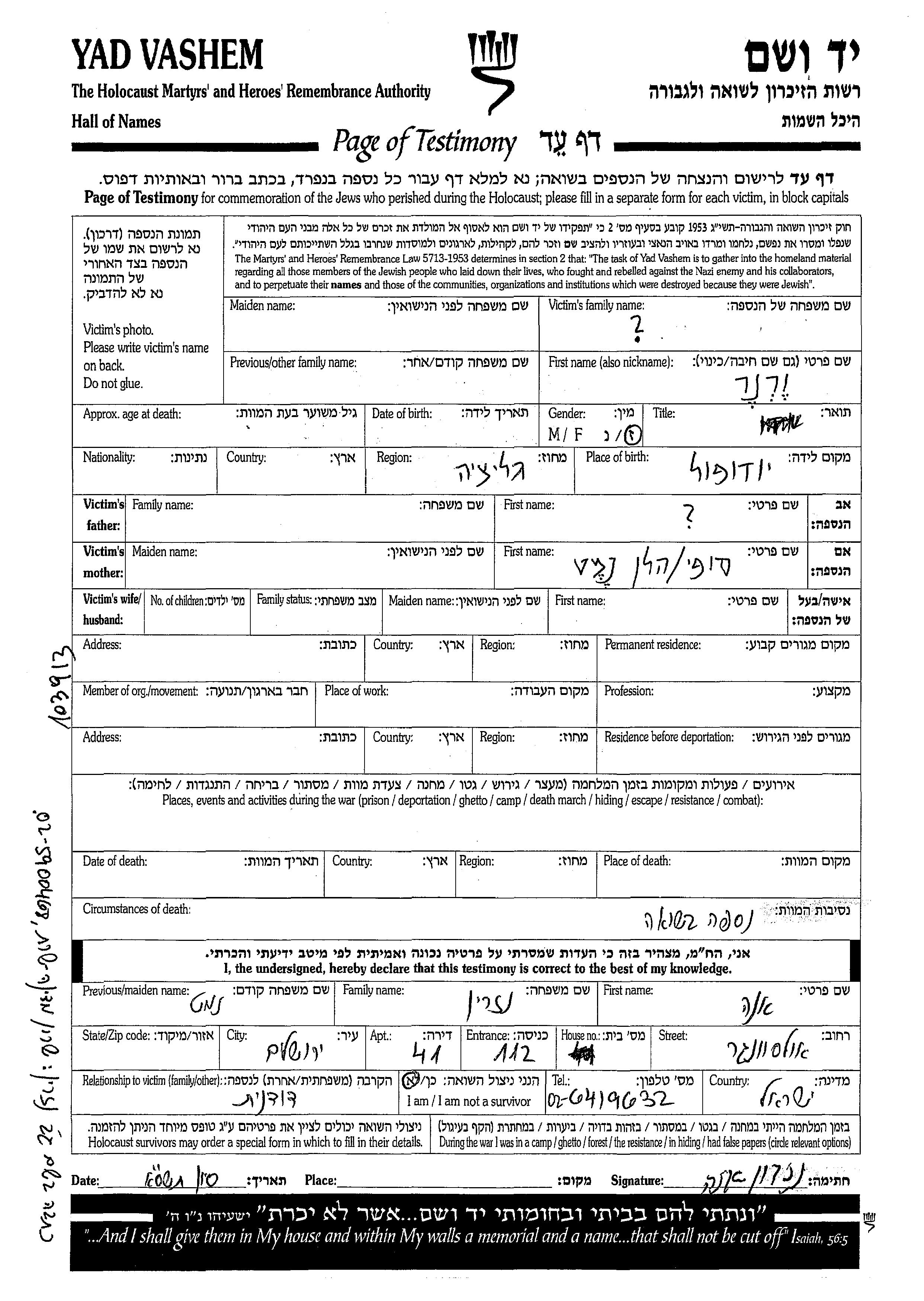 Yad Vashem - Pages of Testimony Names Memorial Collection