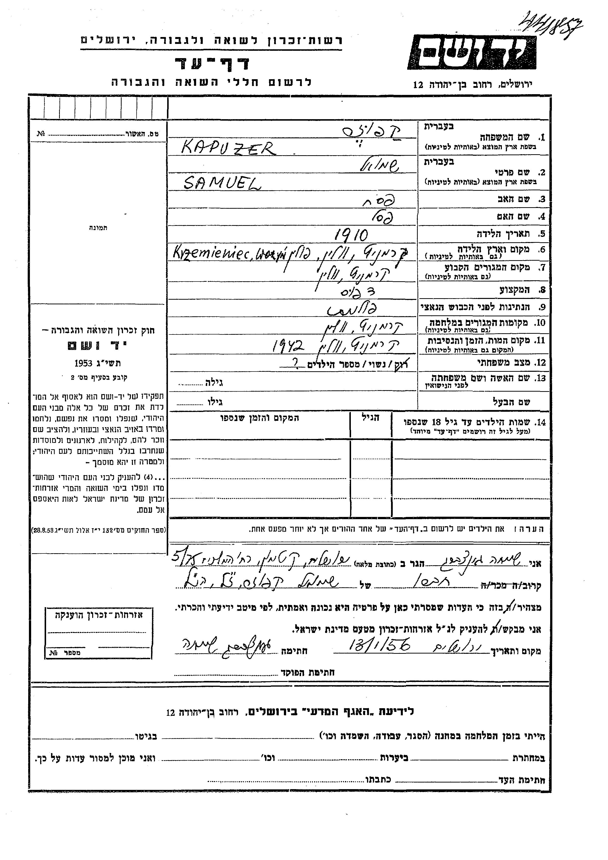 Shmuel Kapuzer est né à Krzemieniec, Pologne en 1910, fils de Pesakh et de Pesel. Il était Marié. Avant la seconde guerre mondiale il vivait à Krzemieniec, Pologne. Au cours de la guerre, il était à Krzemieniec, Pologne.