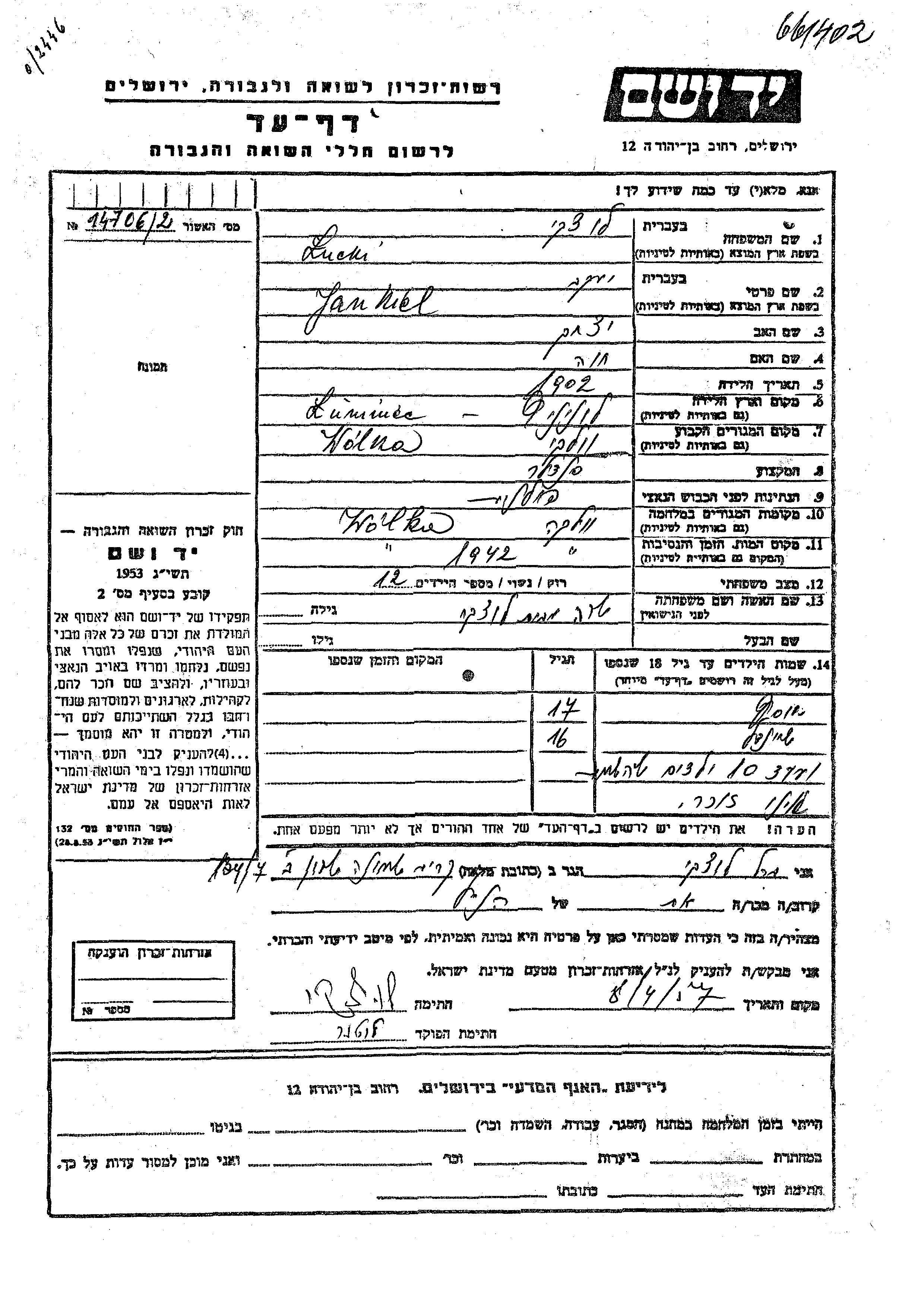 Jankiel Lucki est né à Luniniec, Pologne en 1902, fils de Yitzkhak et de Khava. Il était Cordonnier et Mariée à Sara née Lutzki. Avant la seconde guerre mondiale il vivait à Wolka, Pologne. Au cours de la guerre, il était à Wolka, Pologne.