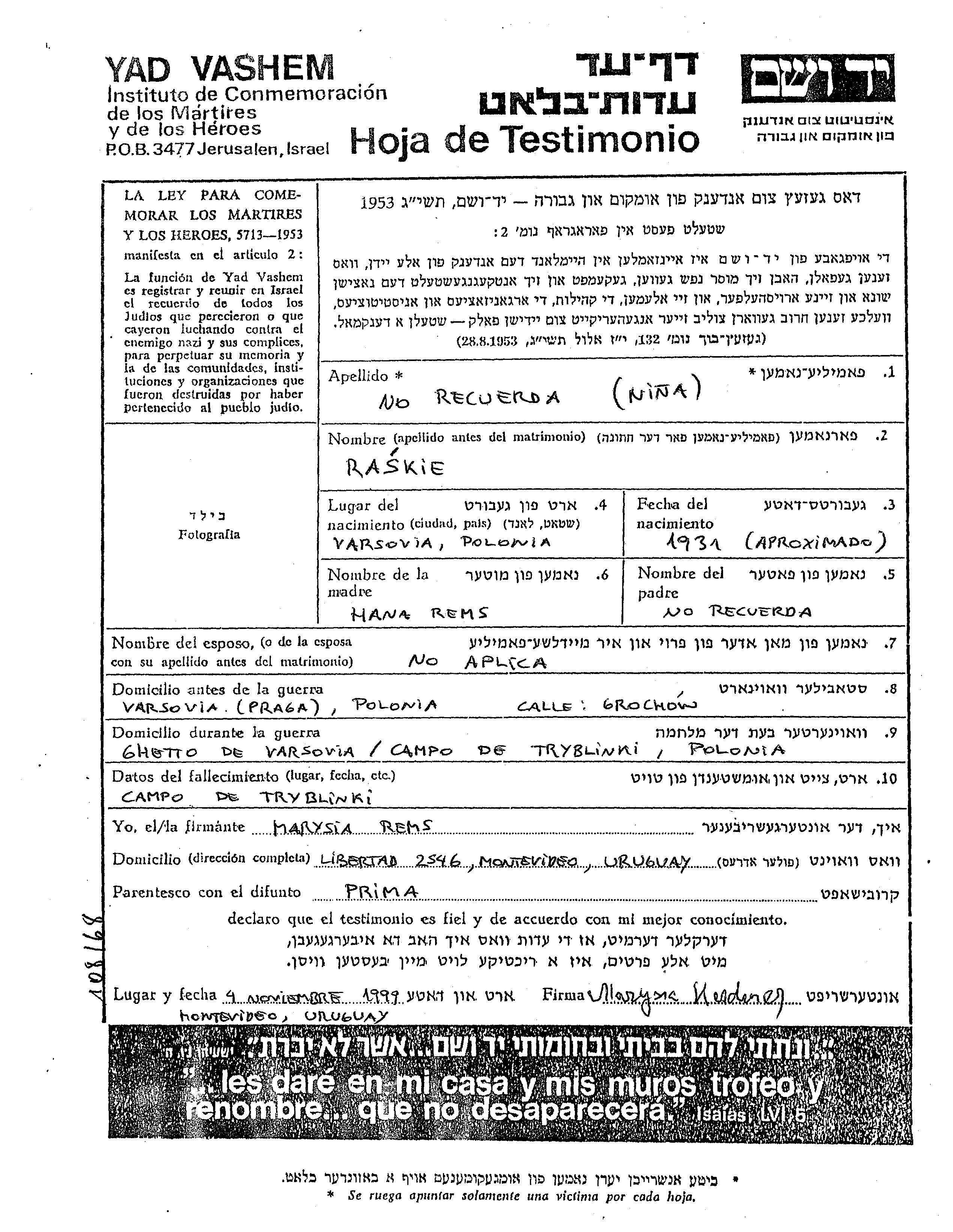 Raskie nom inconnu est née à Varsha, Pologne en 1931, fille de Hana. Avant la seconde guerre mondiale elle vivait à Praga Warszawa, Pologne. Pendant la guerre, elle était à Warszawa, Pologne.
