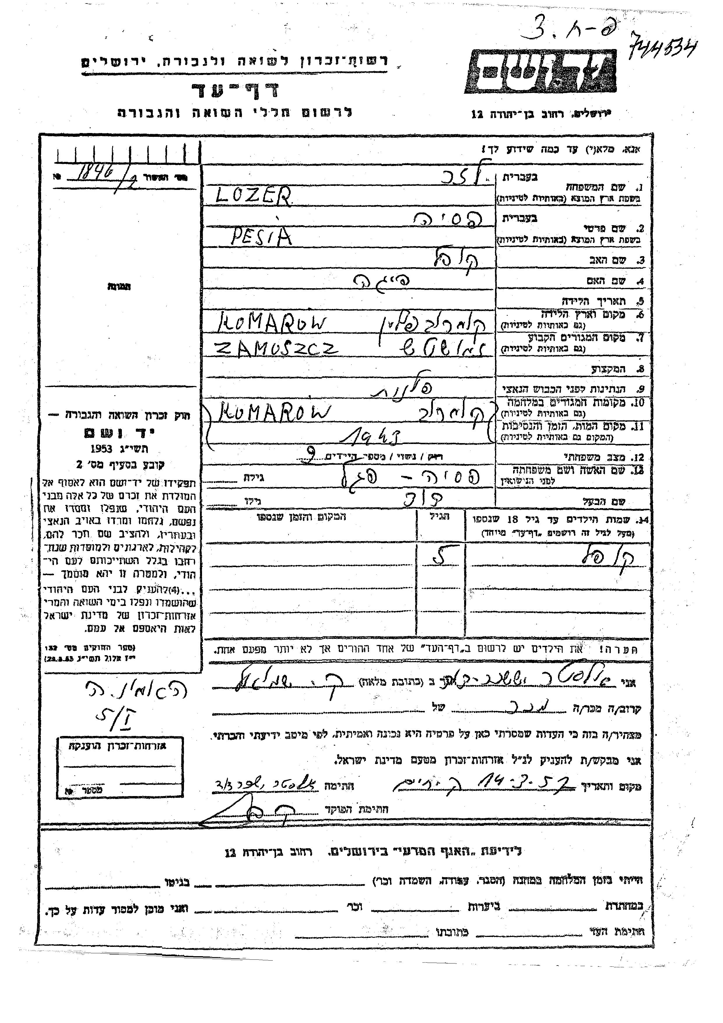 Lozer Lazar Pesia Zamosc, Pologne Feuille de témoignage
